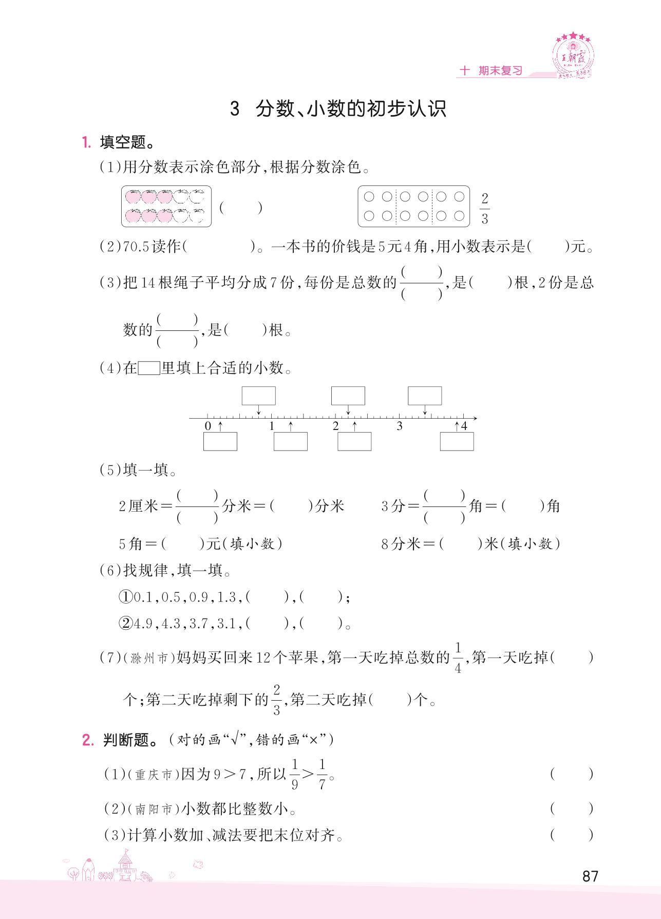 2022下册三年级数学苏教版 十 期末复习——3 分数、小数的初步认识