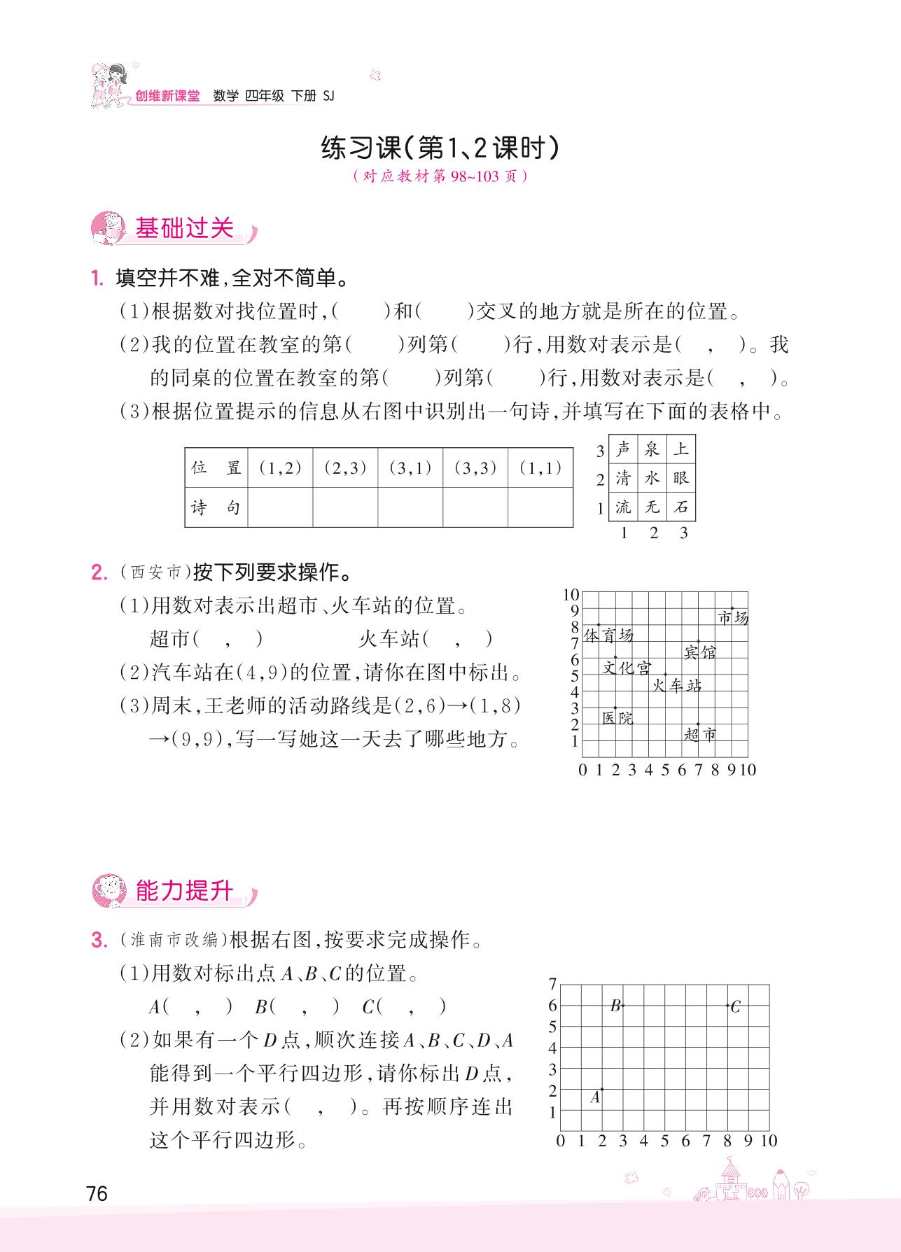 2022下册四年级数学苏教版 八 确定位置——练习课(第1、2课时)