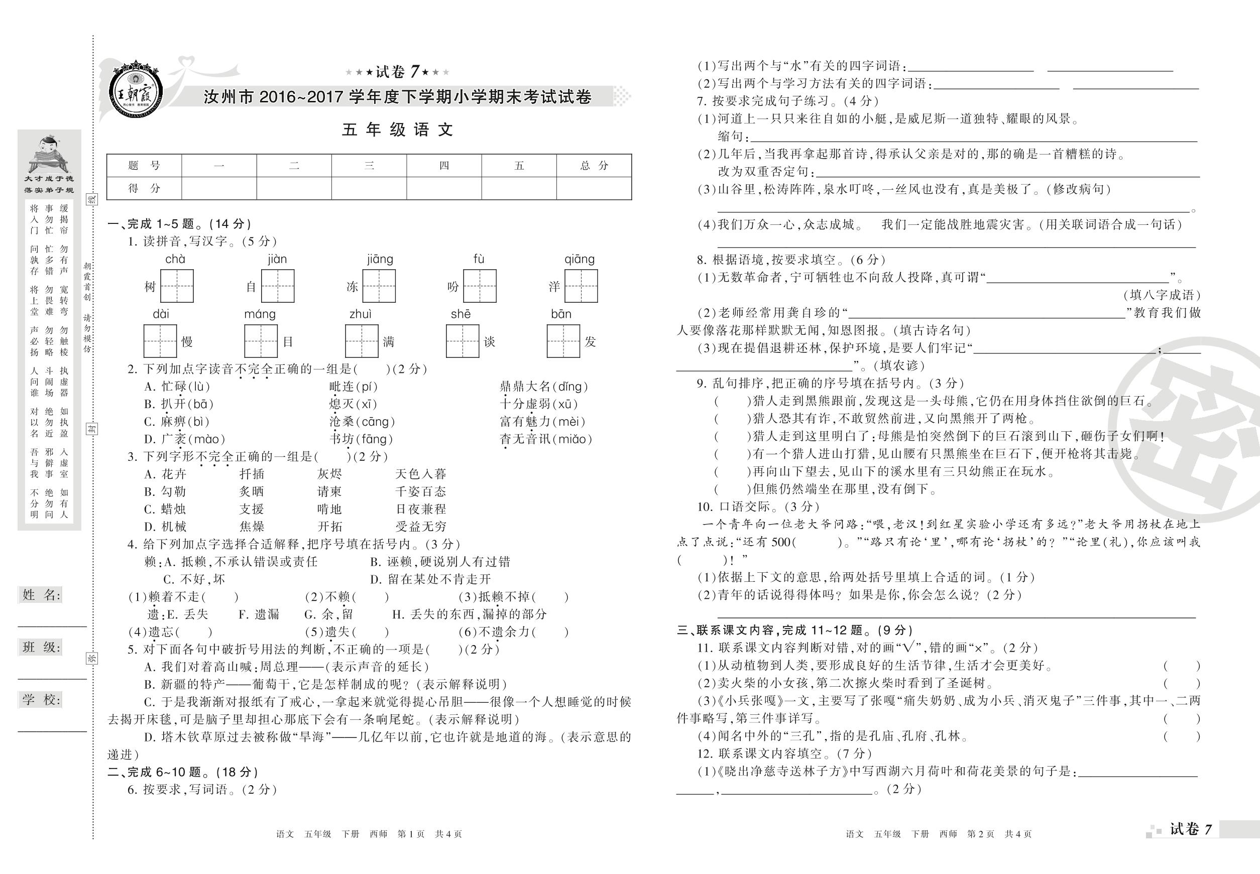 2016-2017学年第二学期汝州市五年级语文试卷(西师版)【7】