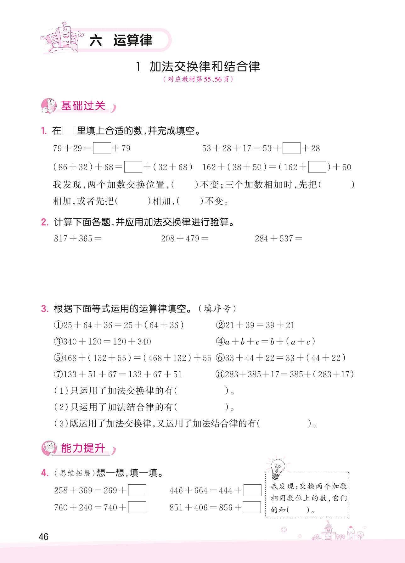2022下册四年级数学苏教版 六 运算律——1 加法交换律和结合律