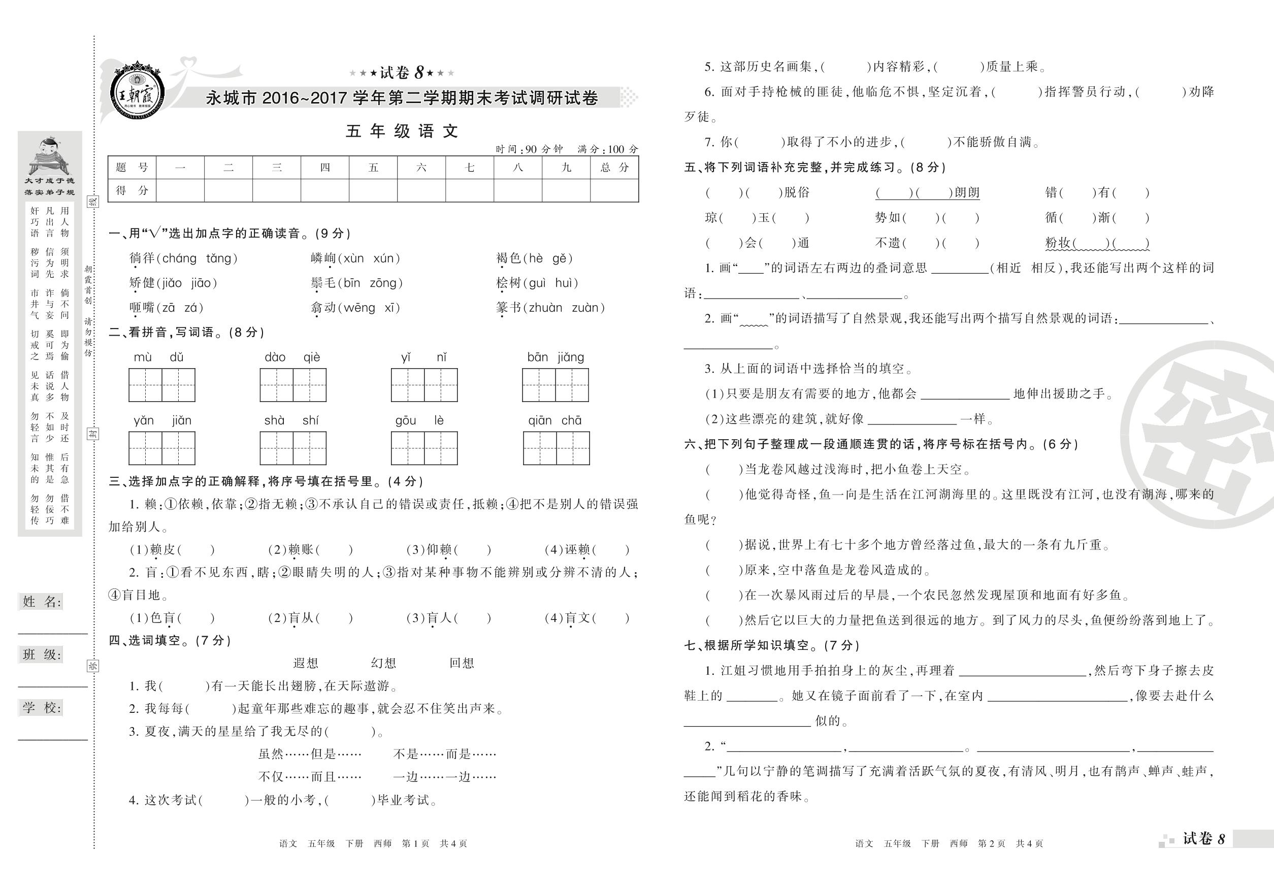 2016-2017学年第二学期永城市五年级语文试卷(西师版)【8】