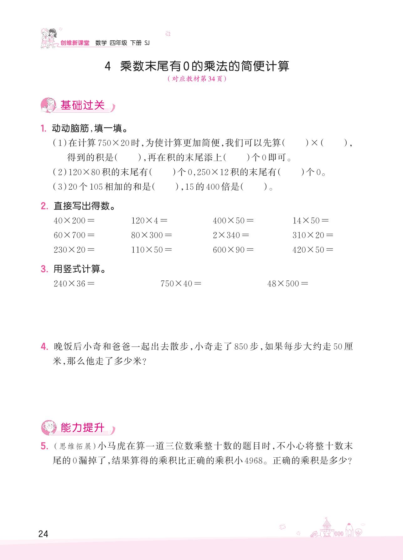 2022下册四年级数学苏教版 三 三位数乘两位数——4 乘数末尾有0的乘法的简便计算