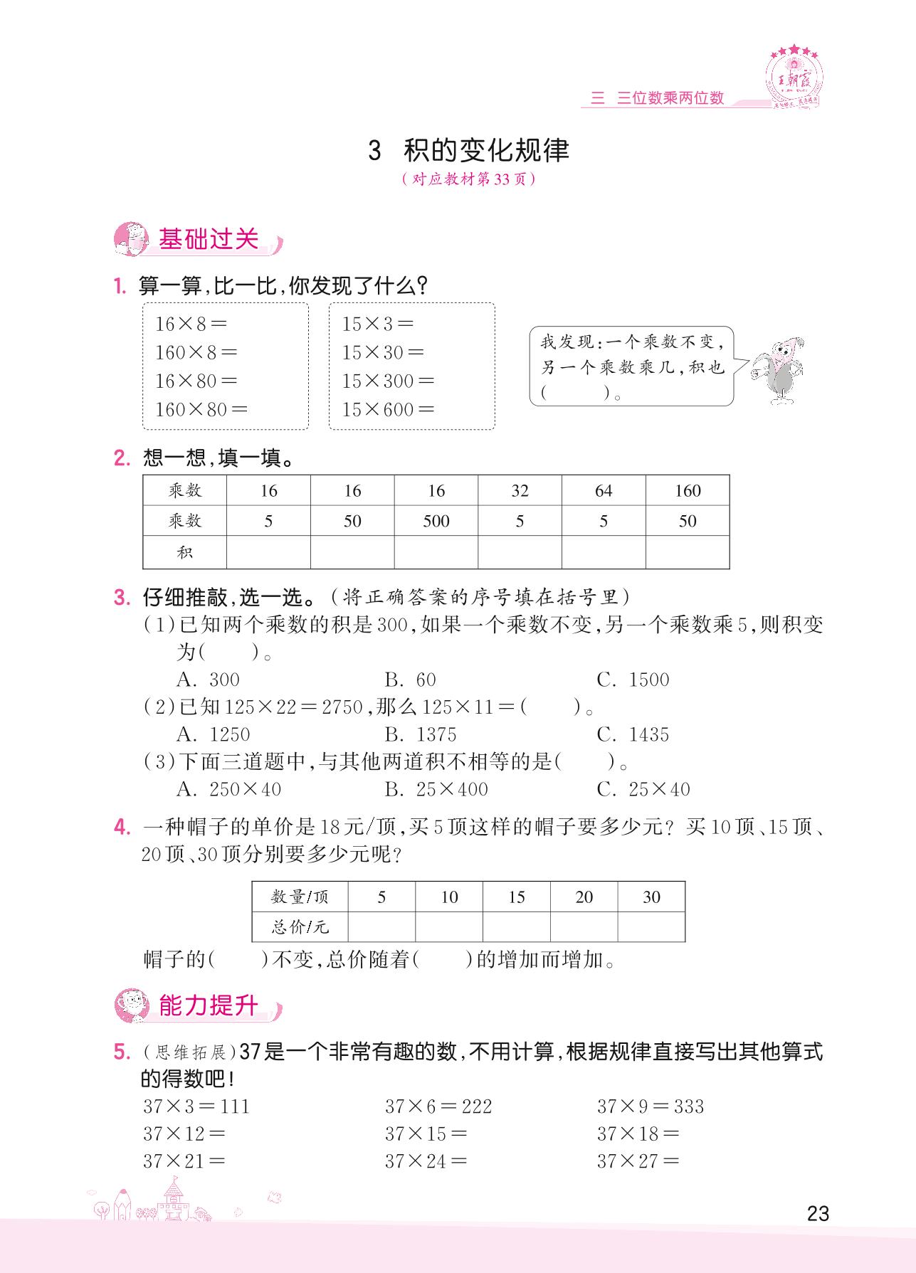 2022下册四年级数学苏教版 三 三位数乘两位数——3 积的变化规律