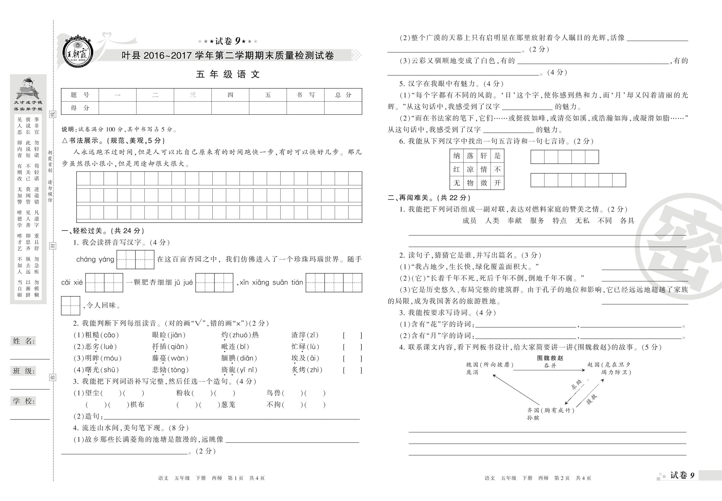 2016-2017学年第二学期平顶山市叶县五年级语文试卷(西师版)【9】