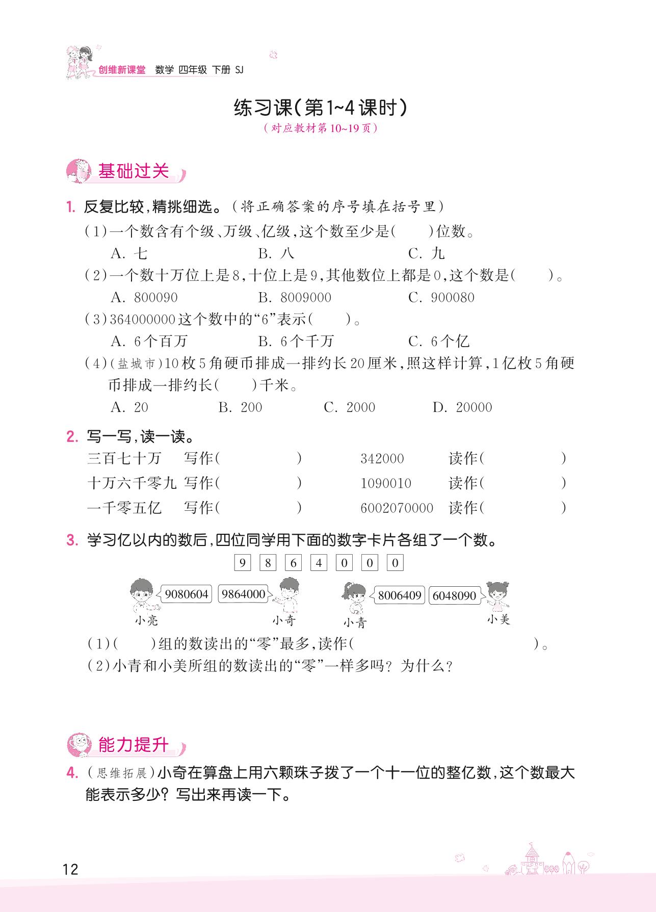 2022下册四年级数学苏教版 二 认识多位数——练习课(第1~4课时)