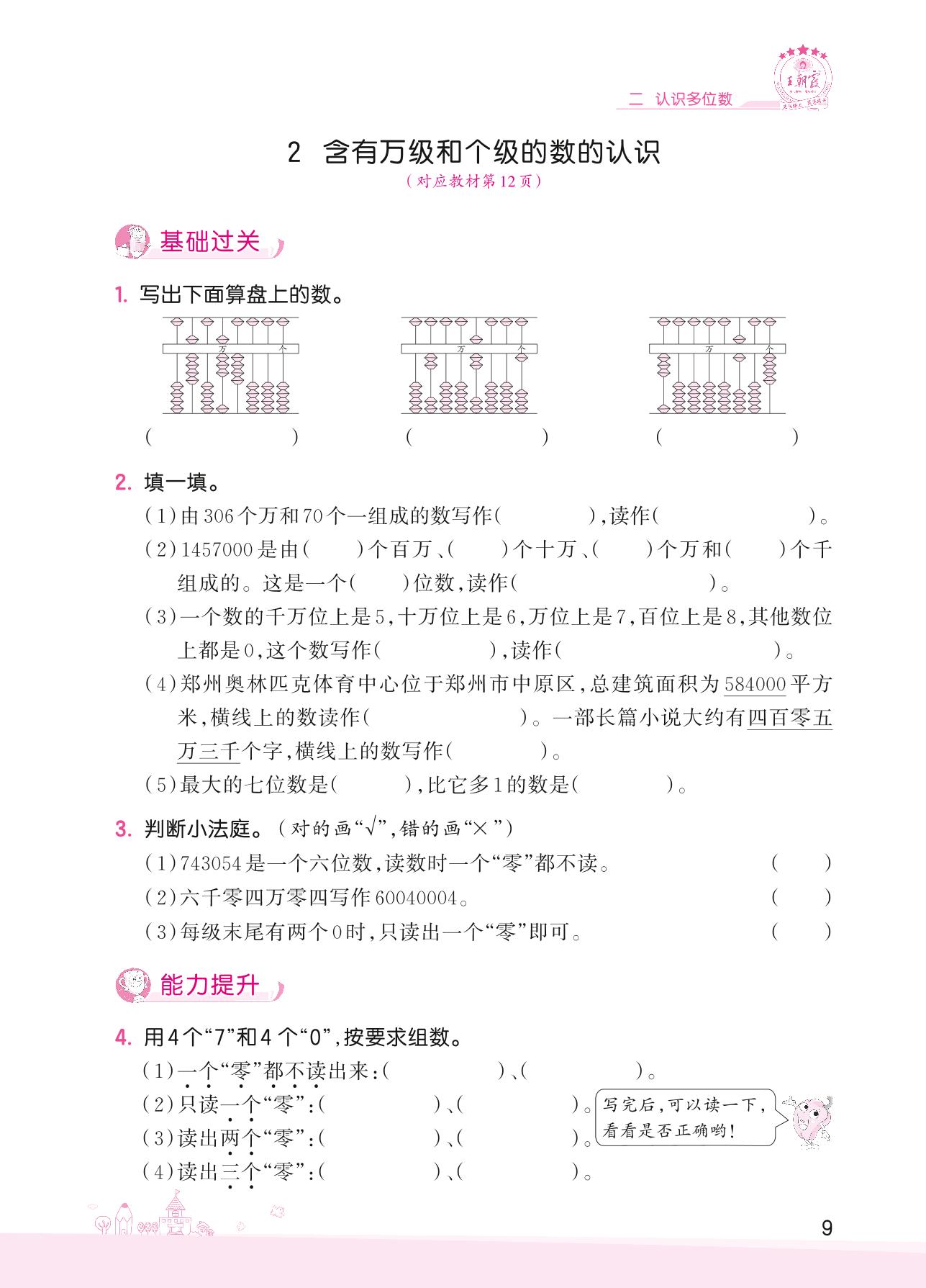 2022下册四年级数学苏教版 二 认识多位数——2 含有万级和个级的数的认识