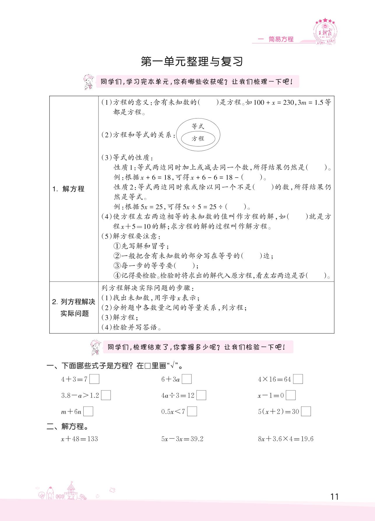2022下册五年级数学苏教版 一 简易方程——第一单元整理与复习