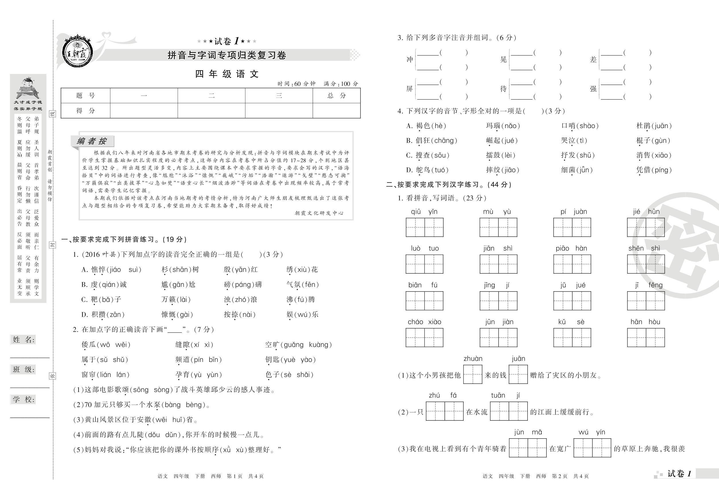 王朝霞期末专项卷——拼音与字词专项归类复习卷四年级下册语文(西师版)_R210801225721【1】