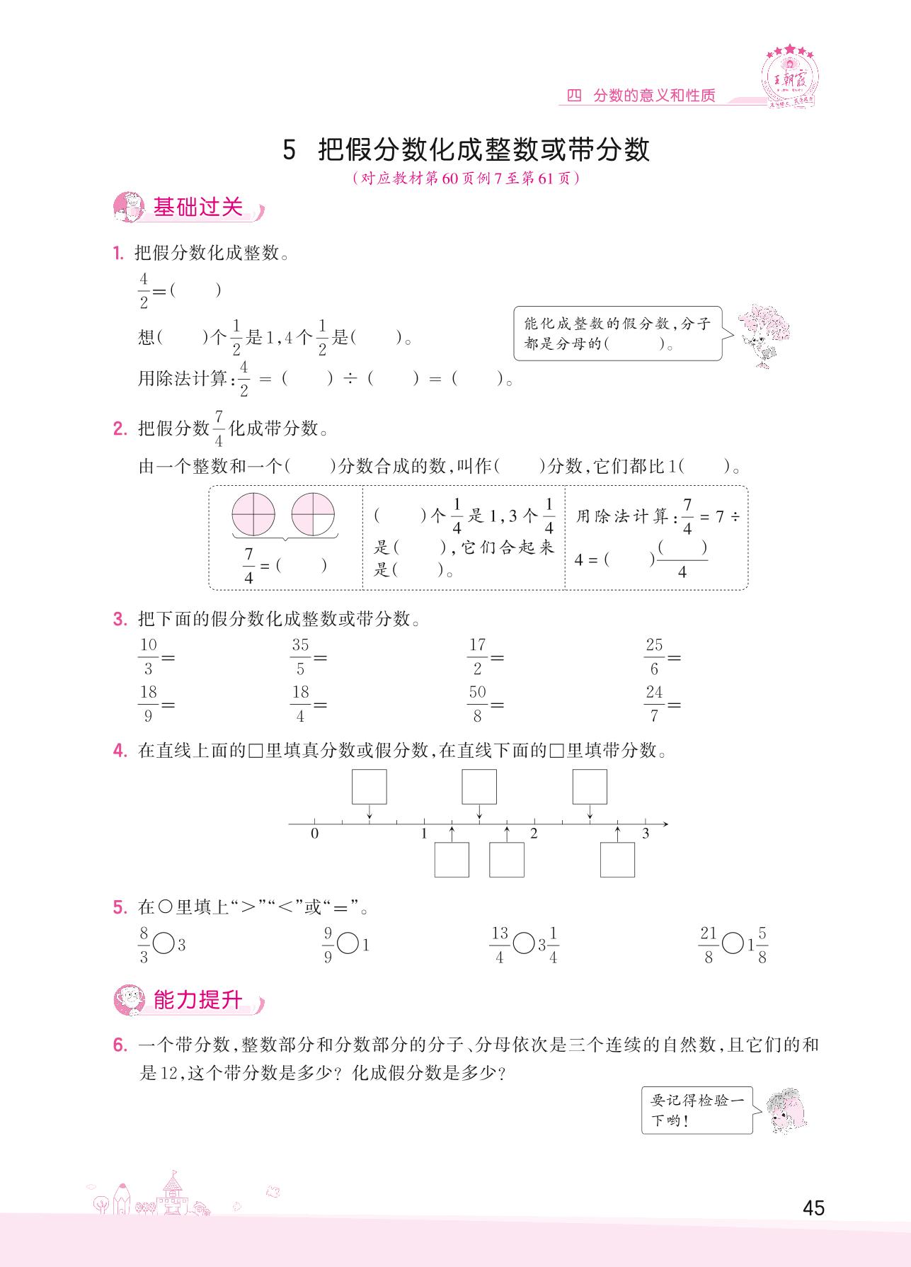 2022下册五年级数学苏教版 四 分数的意义和性质——5 把假分数化成整数或带分数