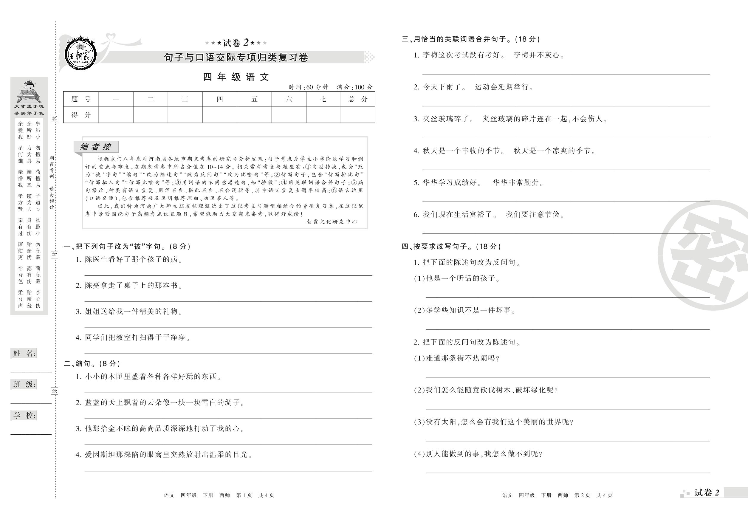 王朝霞期末专项卷——句子与口语交际专项归类复习卷四年级下册语文(西师版)_R210801225723【2】
