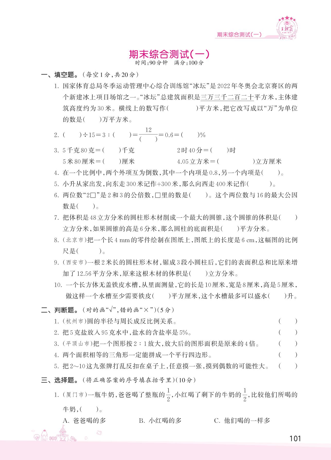 2022下册六年级数学苏教版 期末综合测试(一)