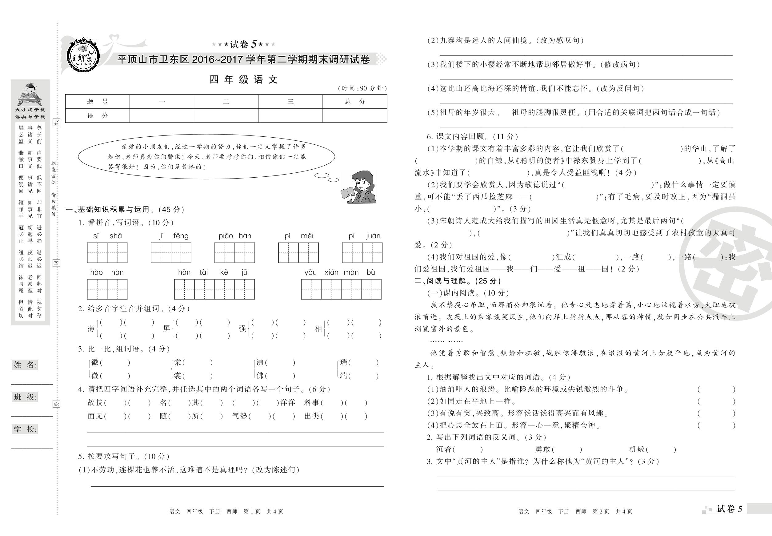 2016-2017学年第二学期平顶山市卫东区四年级语文试卷(西师版)【5】