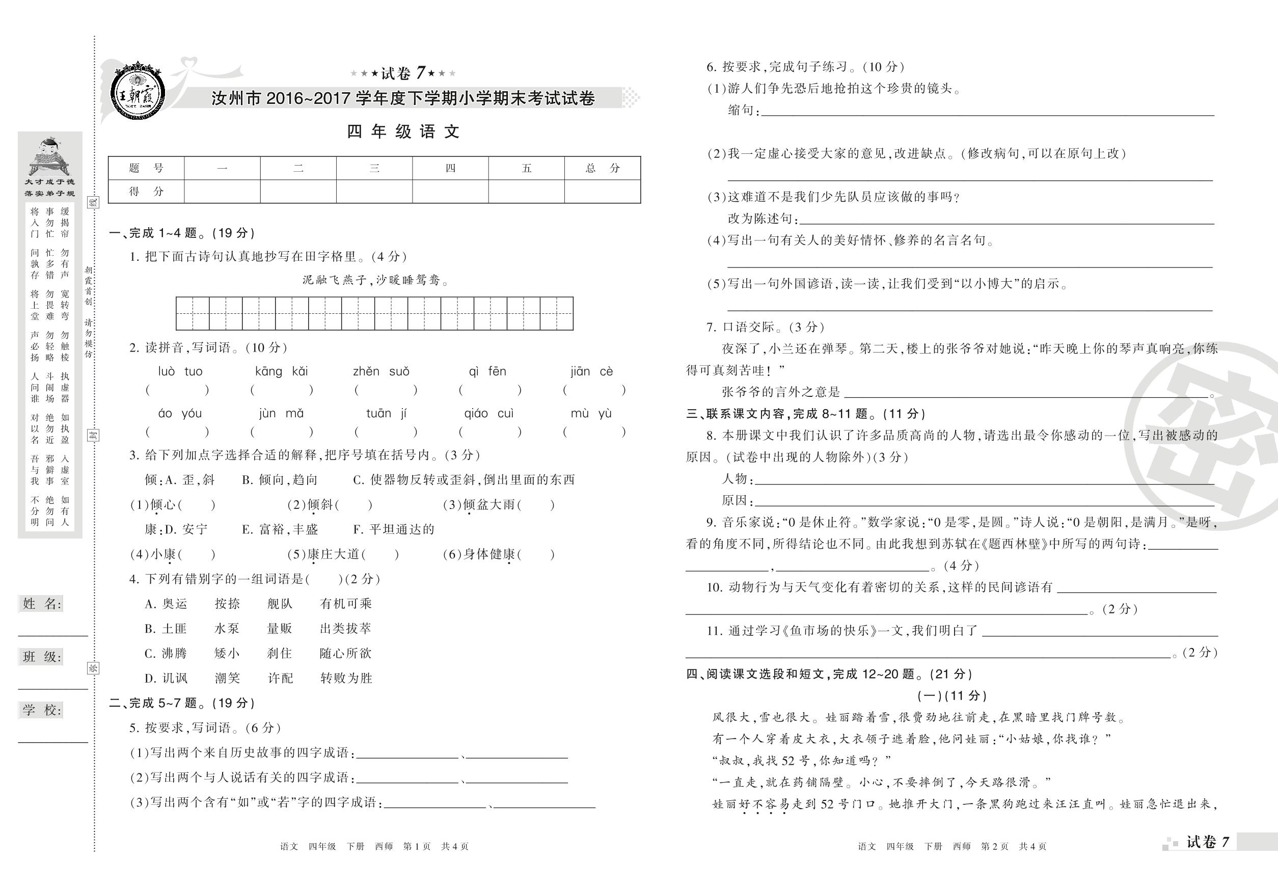 2016-2017学年第二学期汝州市四年级语文试卷(西师版)【7】