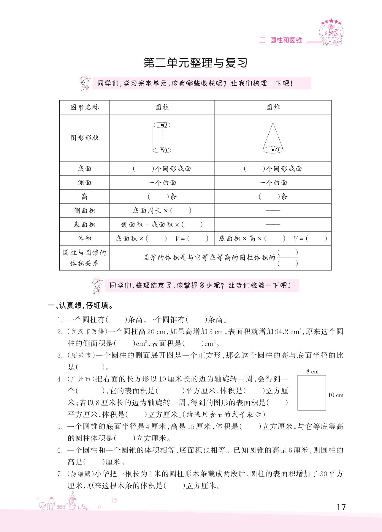 2022下册六年级数学苏教版 二 圆柱和圆锥——第二单元整理与复习
