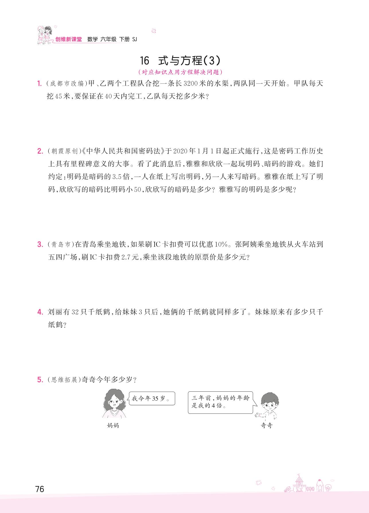 2022下册六年级数学苏教版 七 总复习——16 式与方程(3)