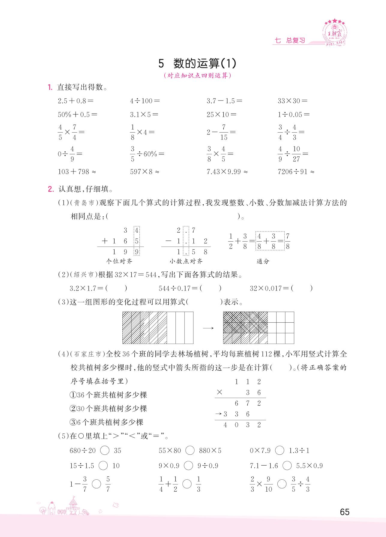 2022下册六年级数学苏教版 七 总复习——5 数的运算(1)