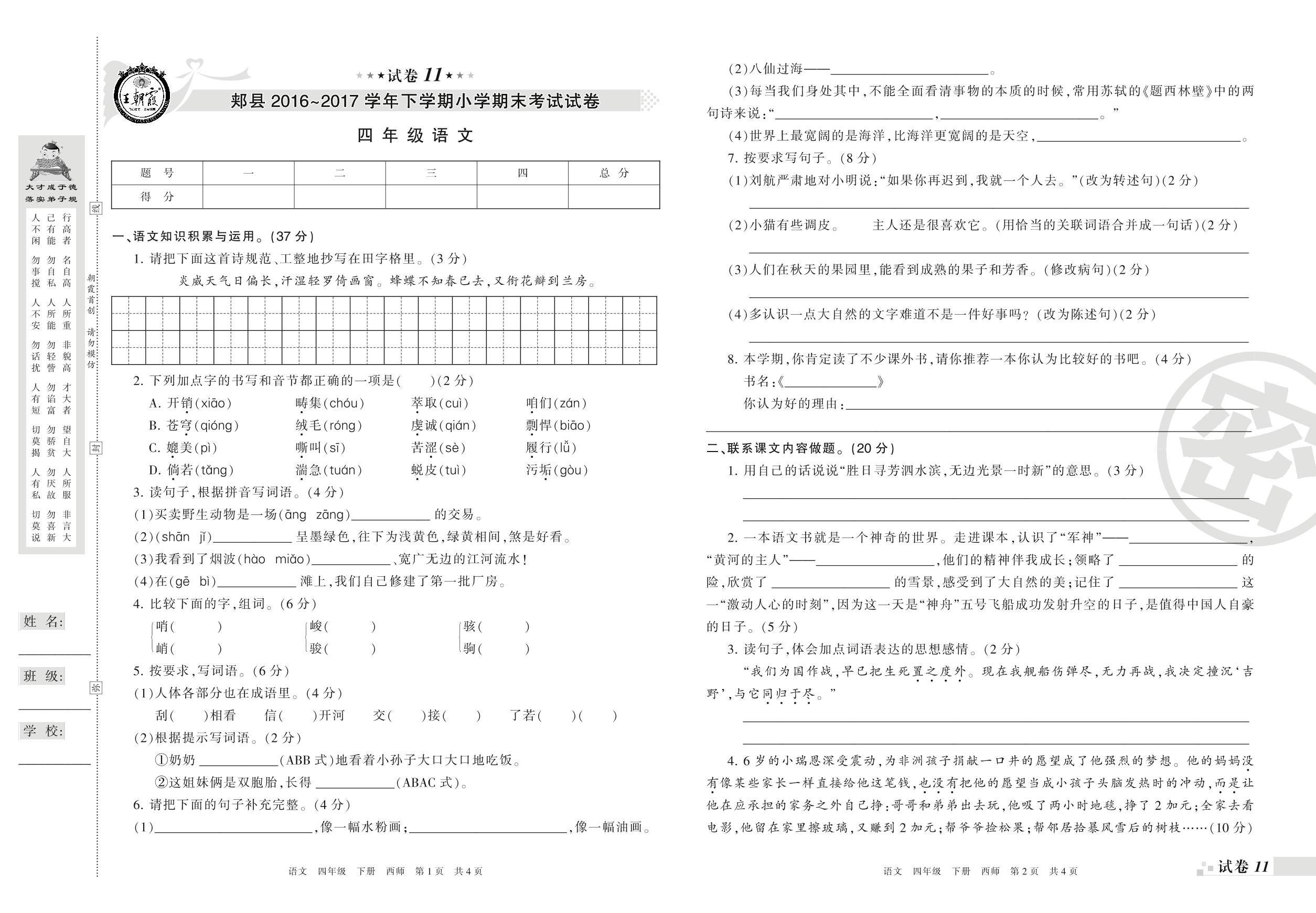2016-2017学年第二学期平顶山市郏县四年级语文试卷(西师版)【11】