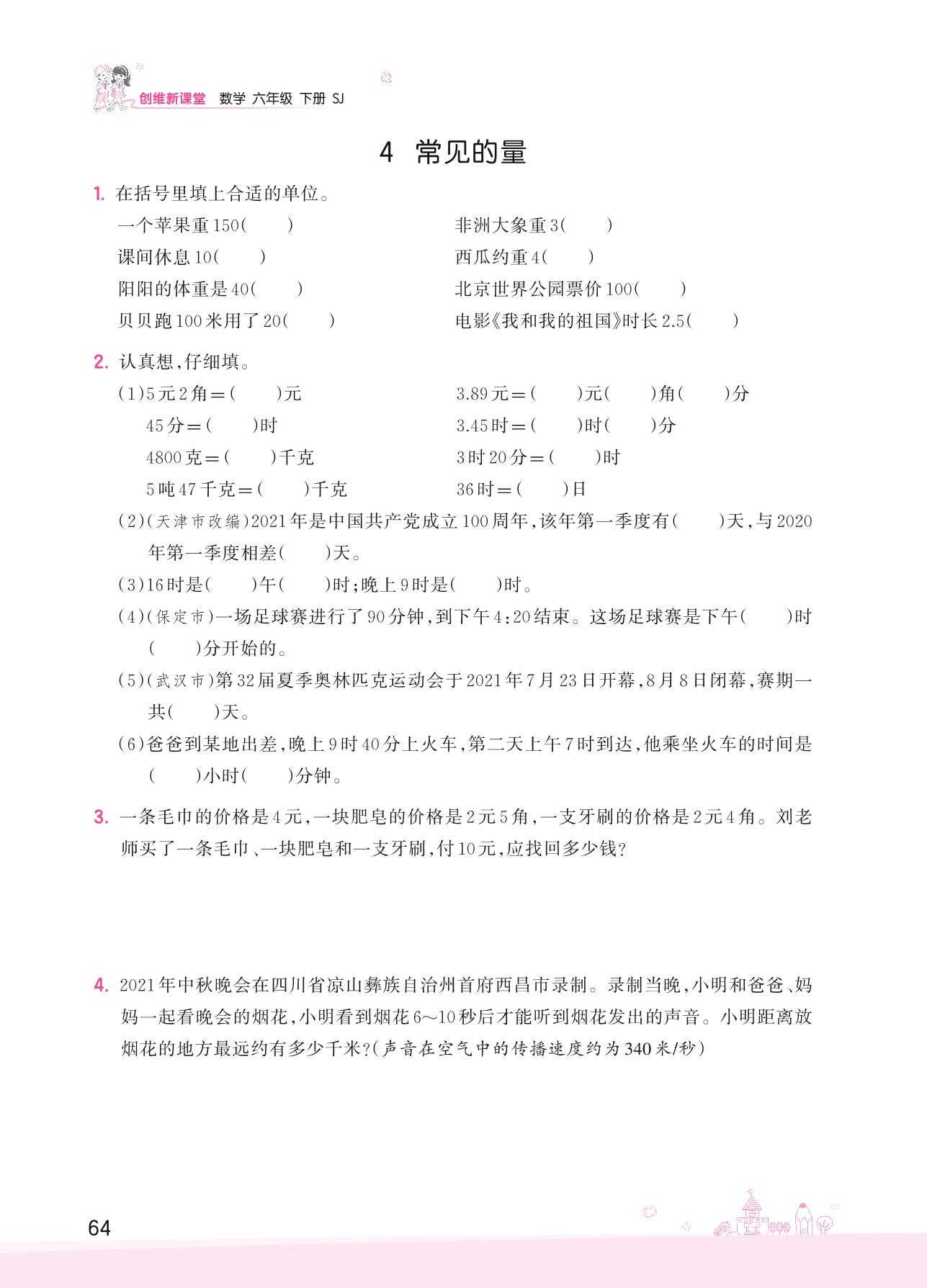 2022下册六年级数学苏教版 七 总复习——4 常见的量
