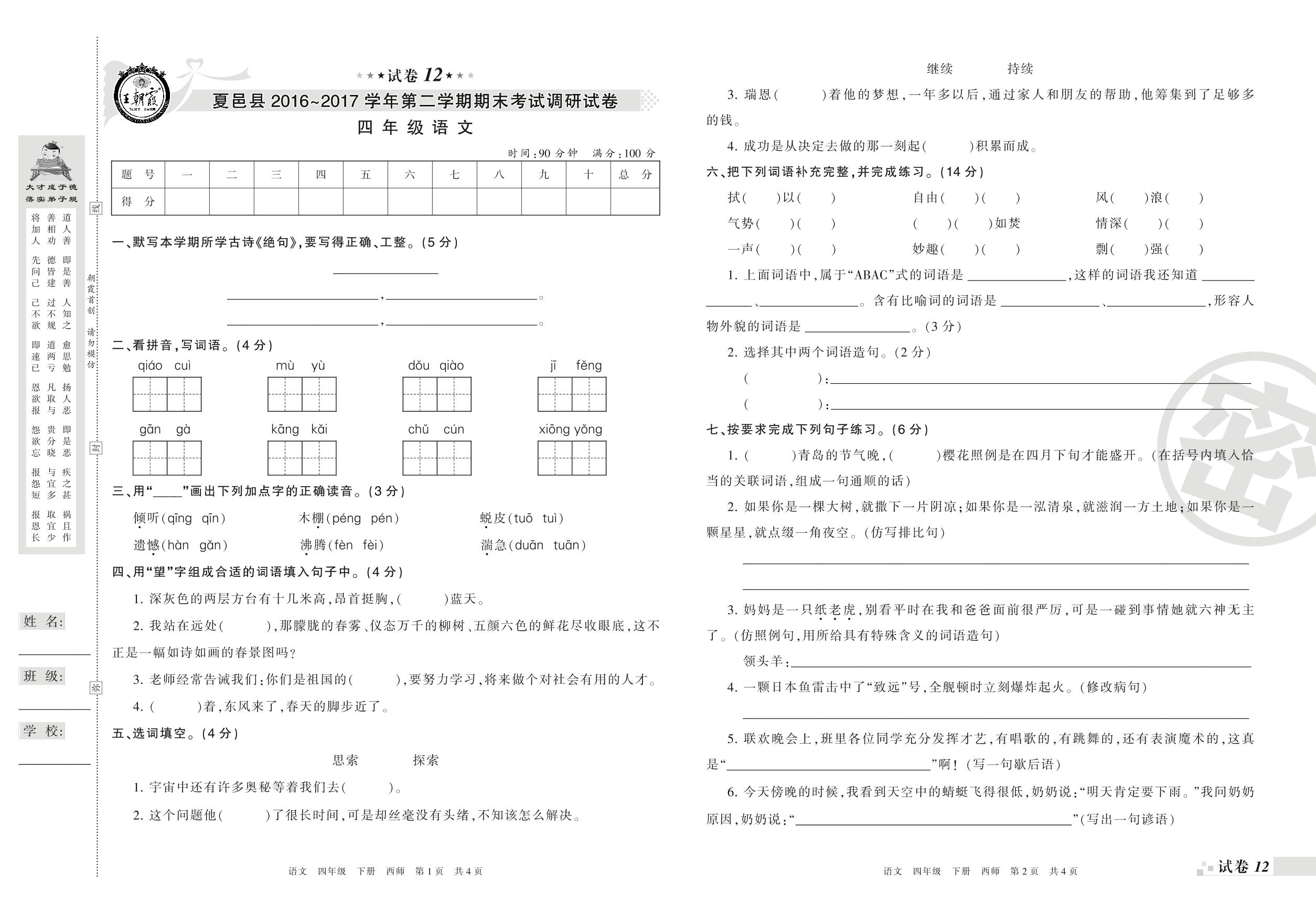 2016-2017学年第二学期商丘市夏邑县四年级语文试卷(西师版)【12】
