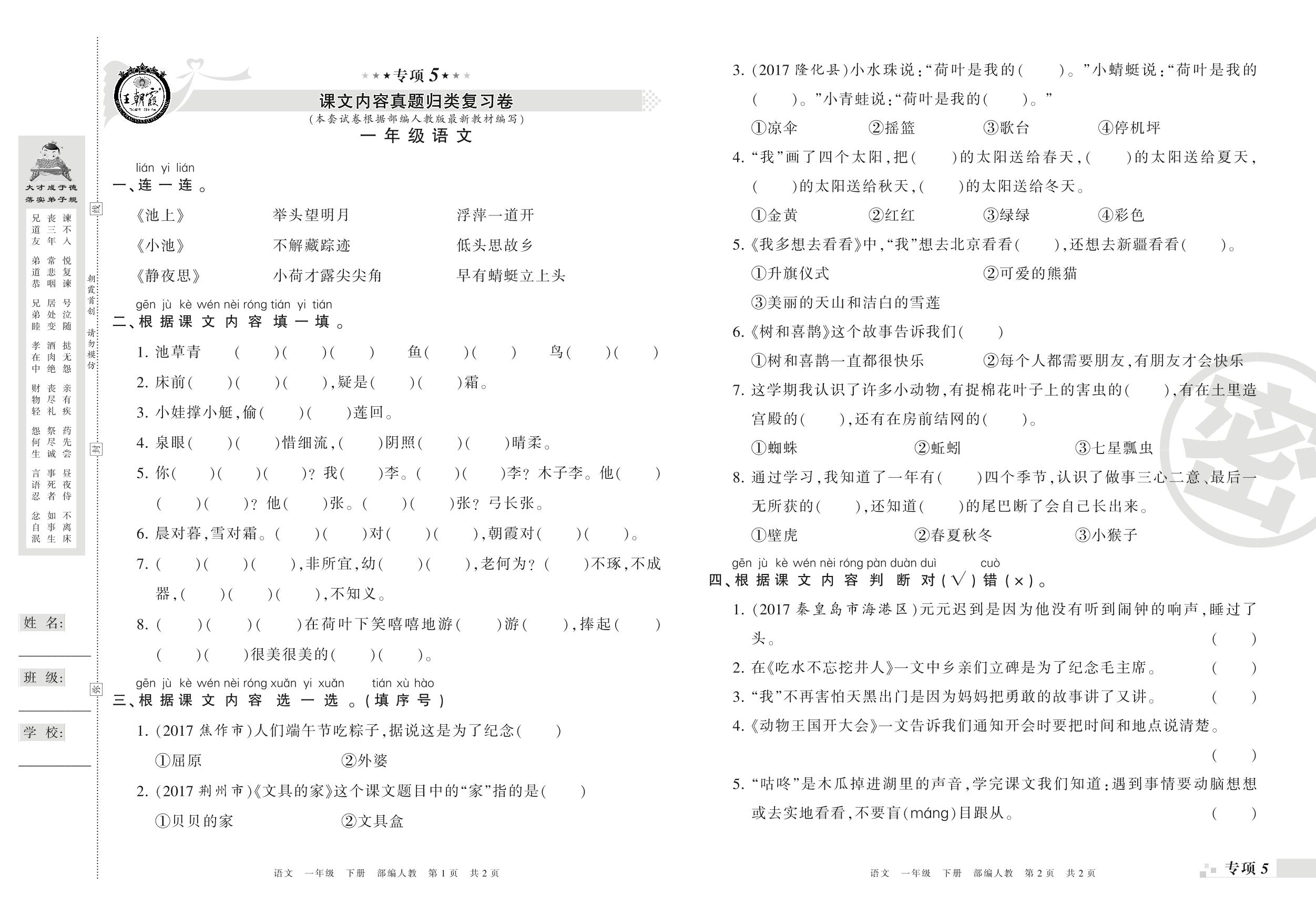 王朝霞期末专项卷——课文内容、积累运用真题归类复习一年级下册语文(人教版)【0】
