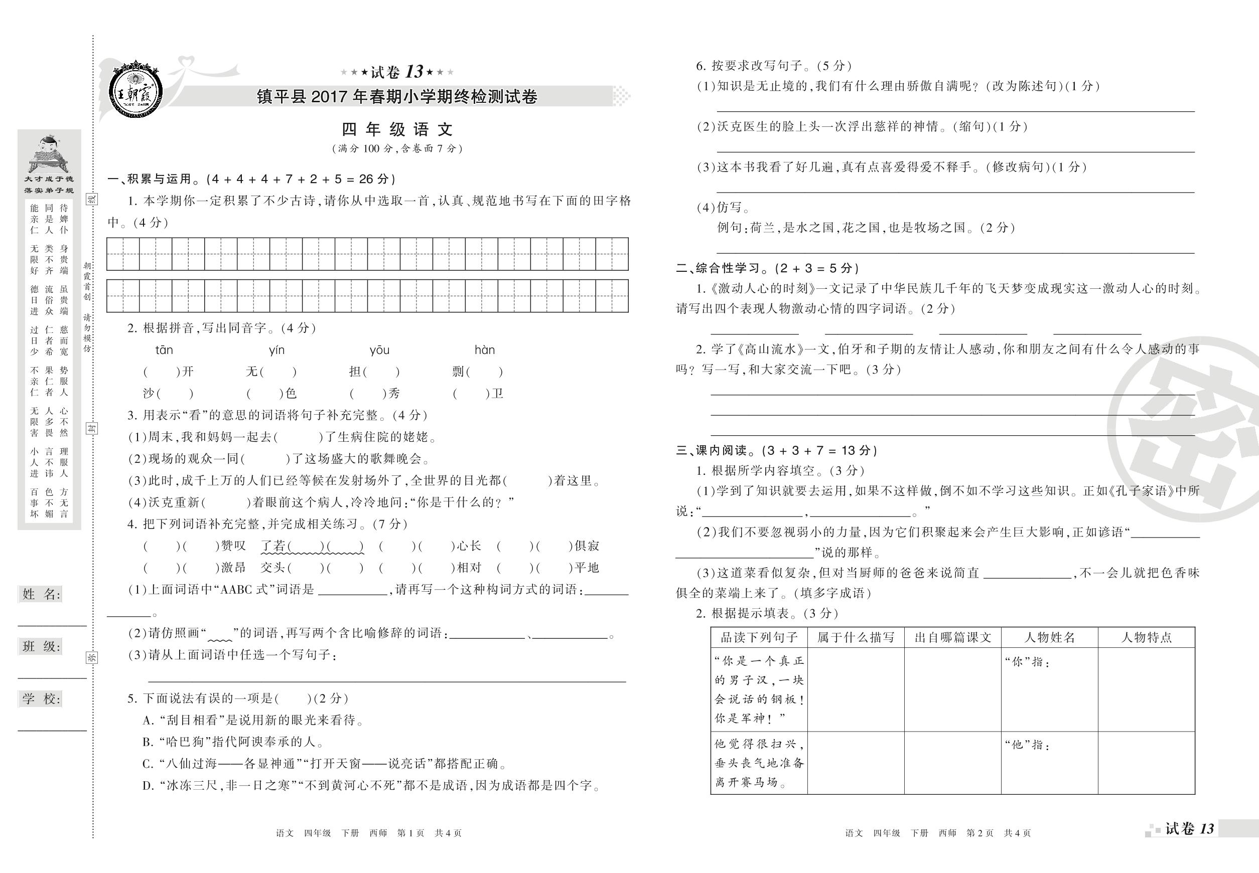 2016-2017学年第二学期南阳市镇平县四年级语文试卷(西师版)【13】