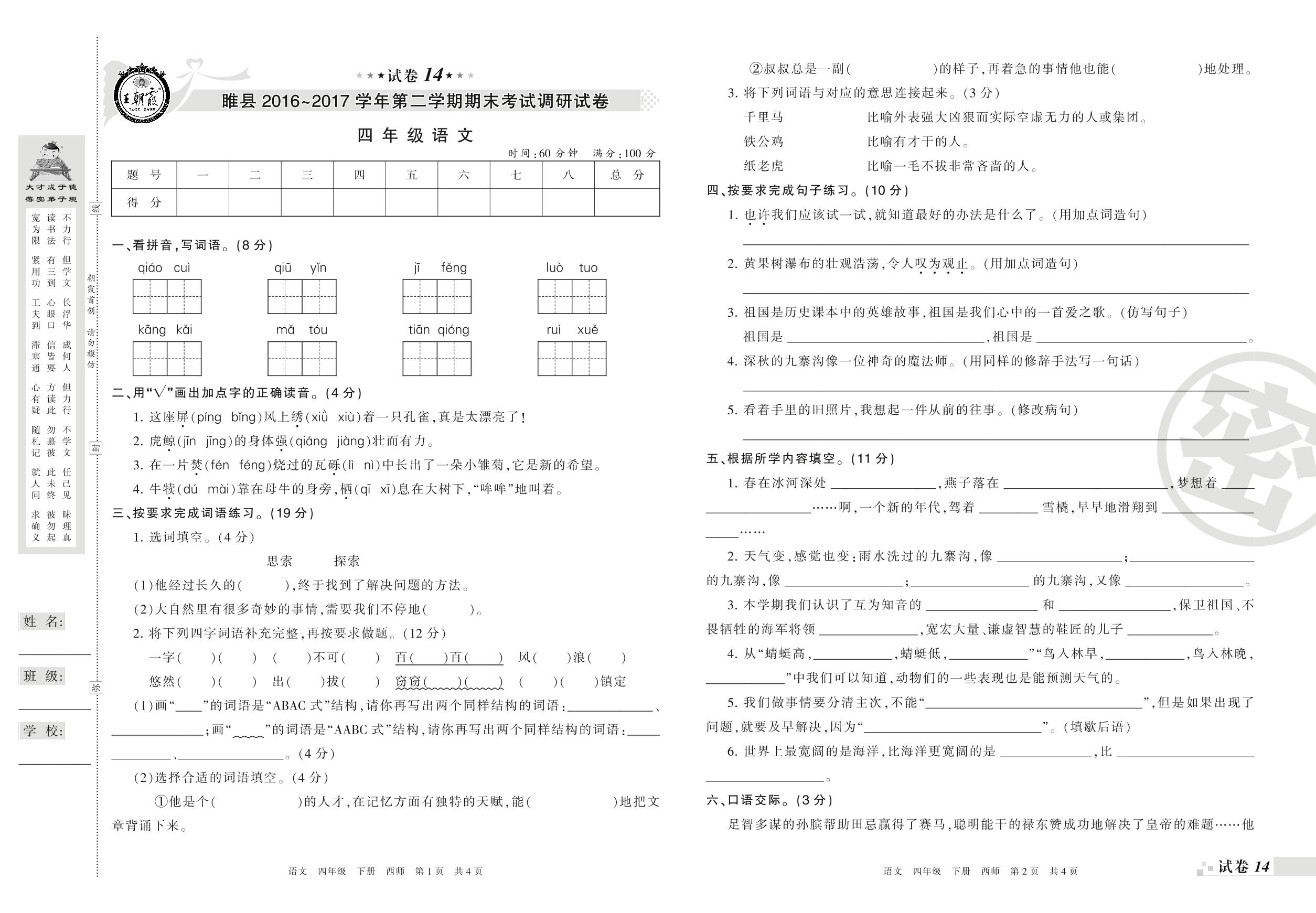 2016-2017学年第二学期商丘市睢县四年级语文试卷(西师版)【14】