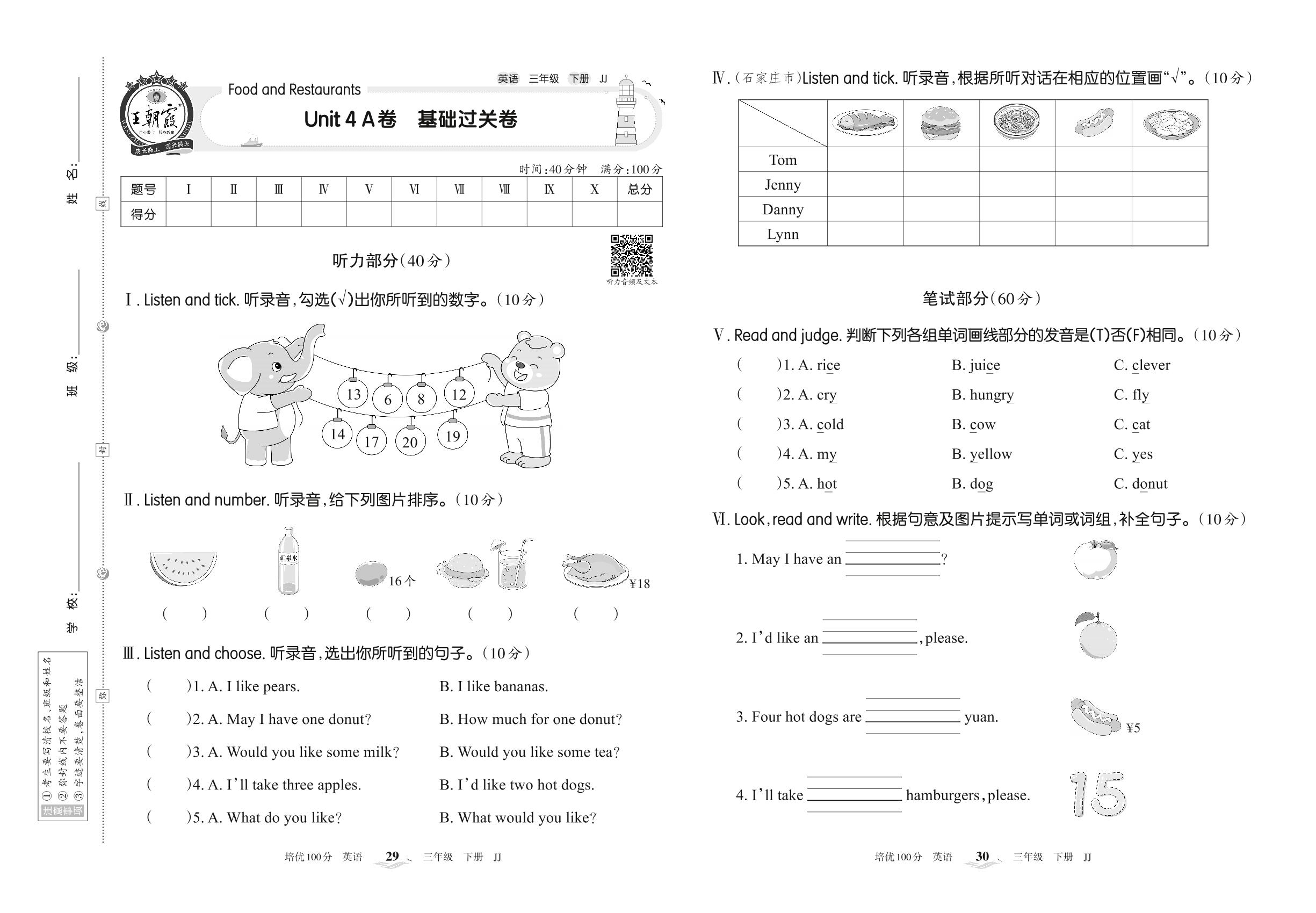 2022下册三年级英语冀教版 Unit 4 A卷 基础过关卷