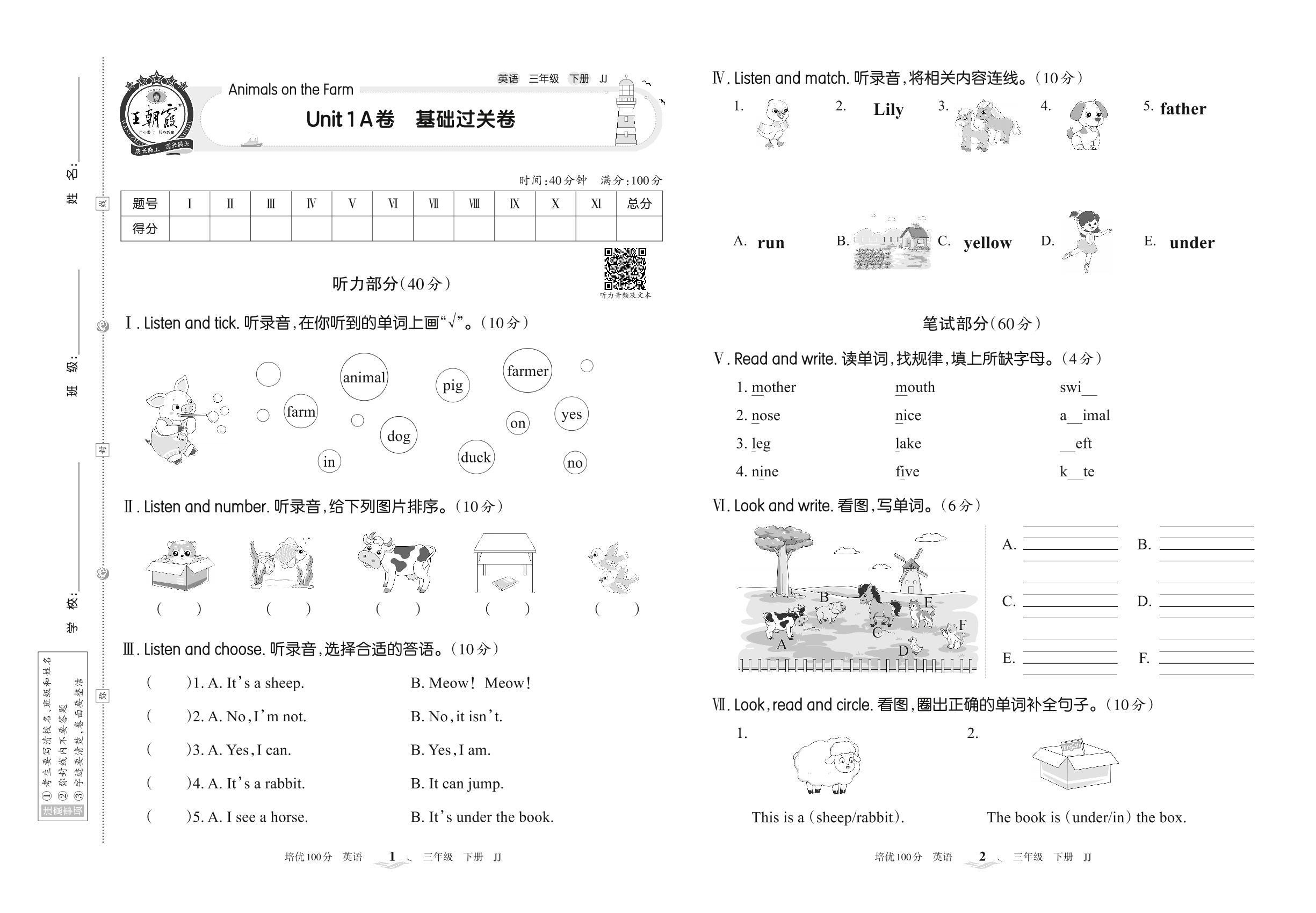 2022下册三年级英语冀教版 Unit 1 A卷 基础过关卷