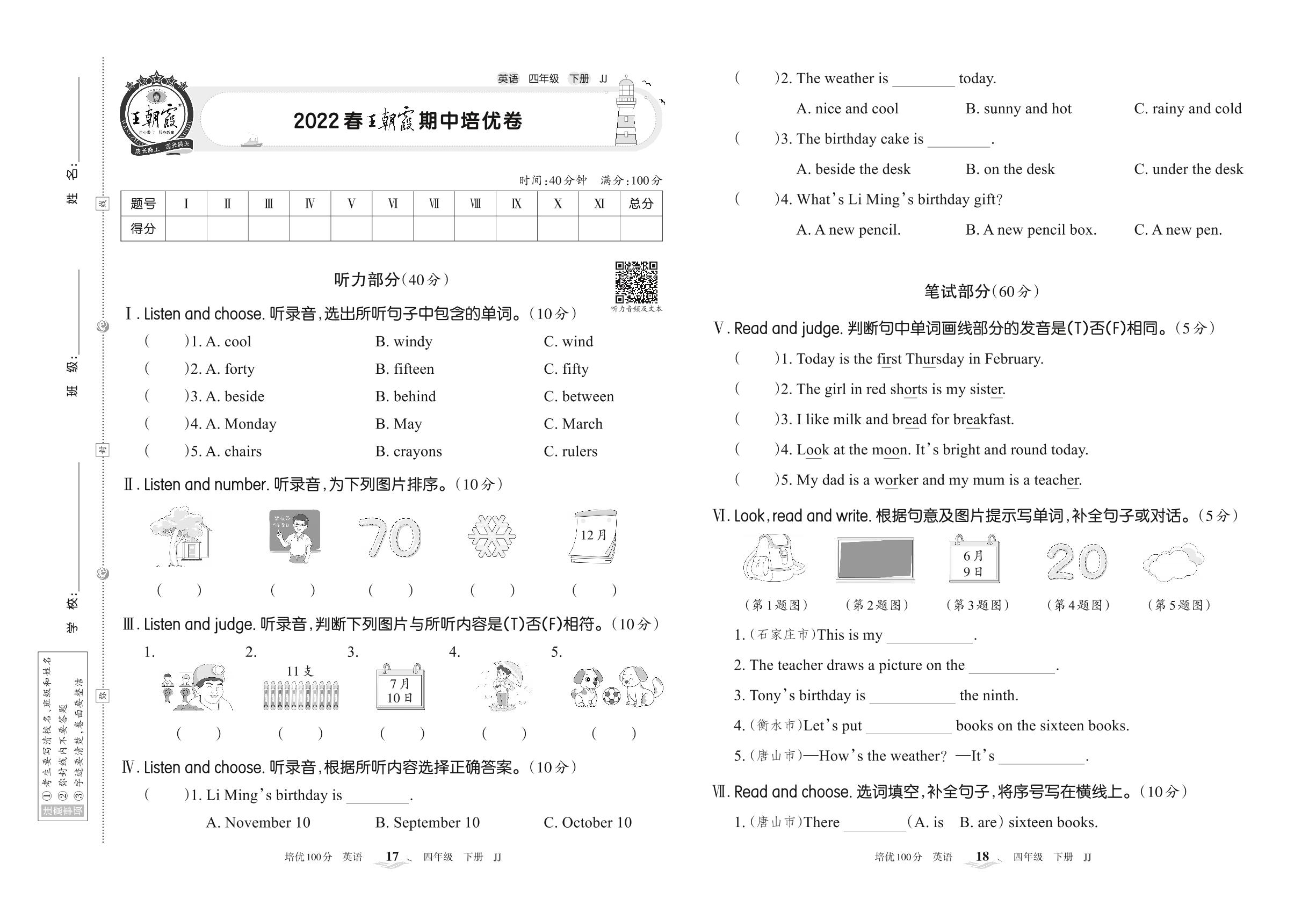 2022下册四年级英语冀教版 王朝霞期中培优卷