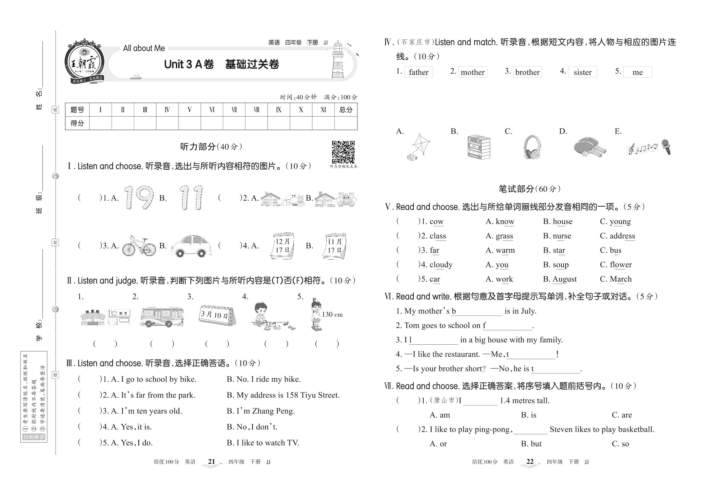 四年级英语冀教版下册单元卷