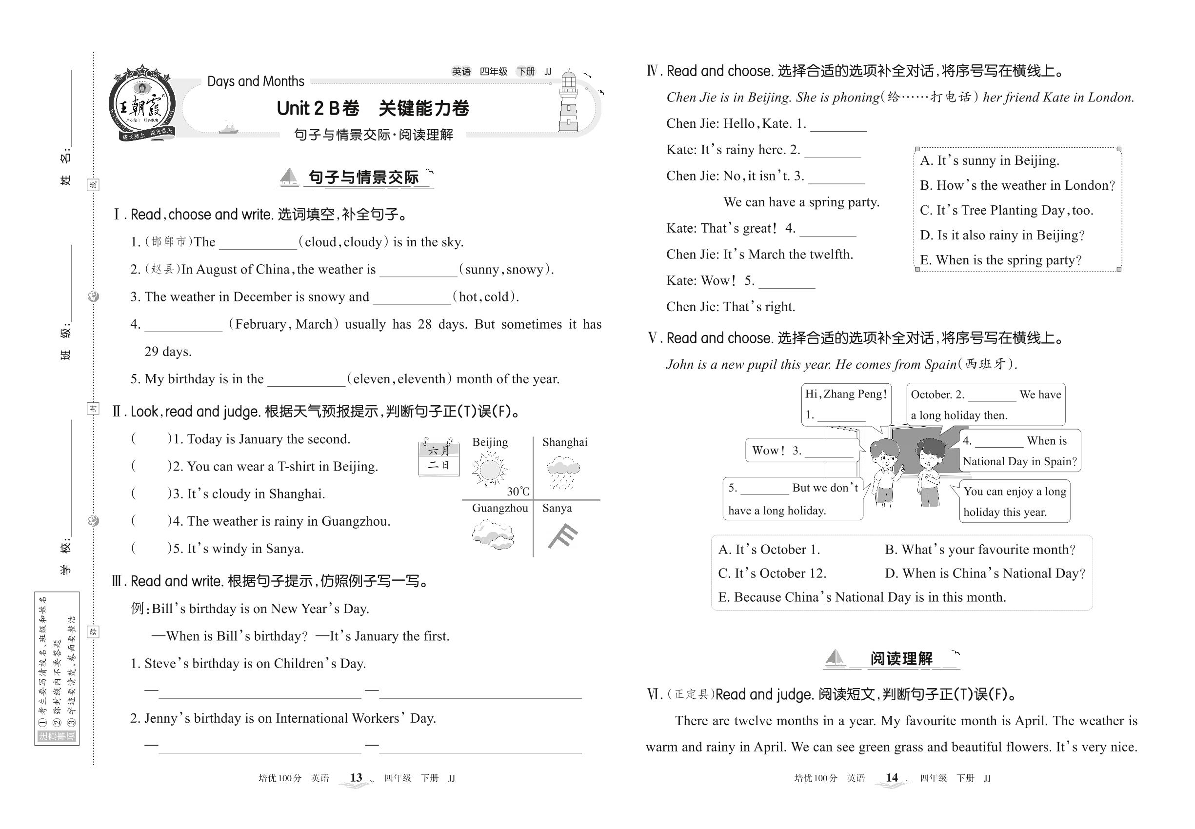 2022下册四年级英语冀教版 Unit 2 B卷 关键能力卷