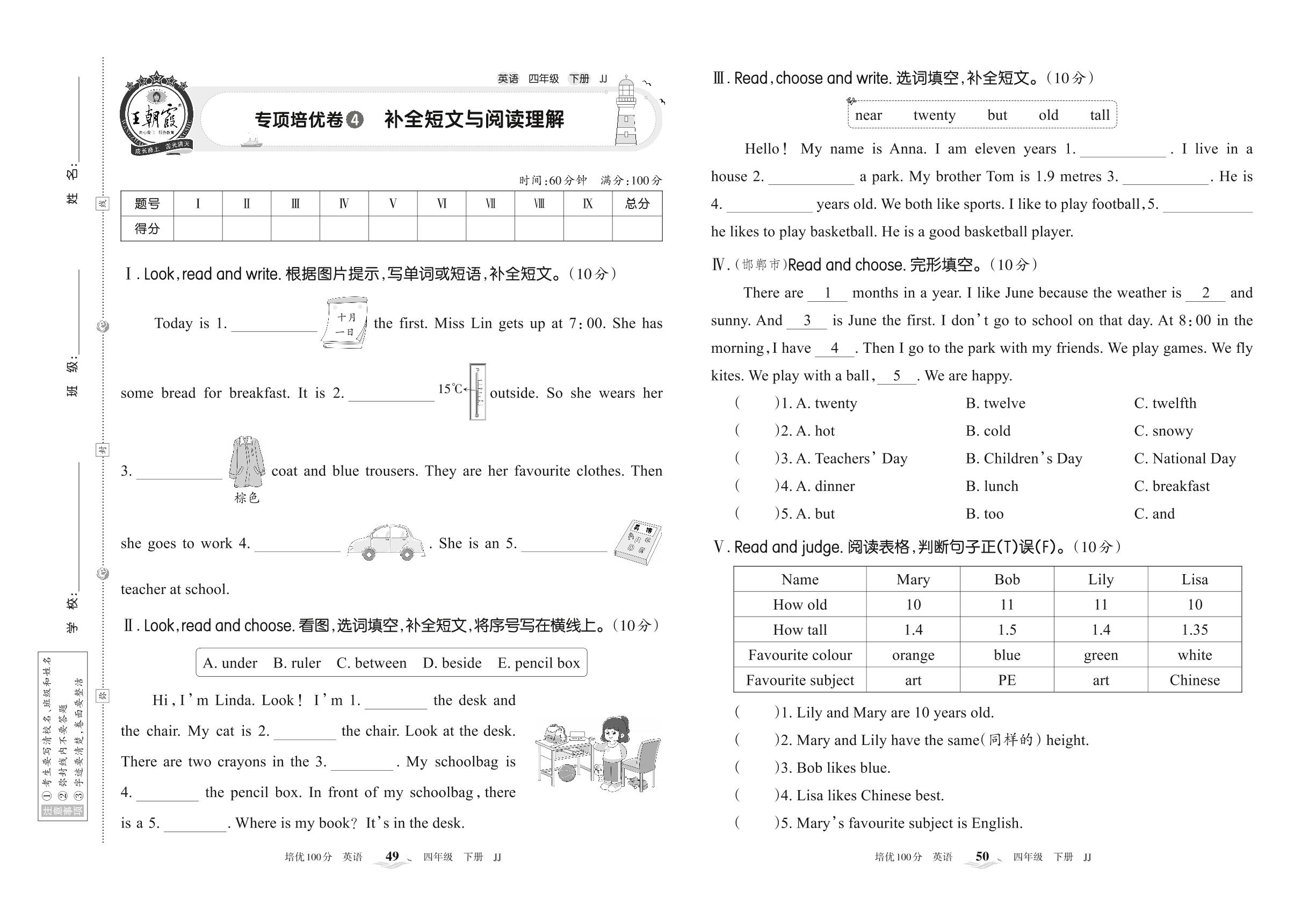 2022下册四年级英语冀教版 专项培优卷4 补全短文与阅读理解