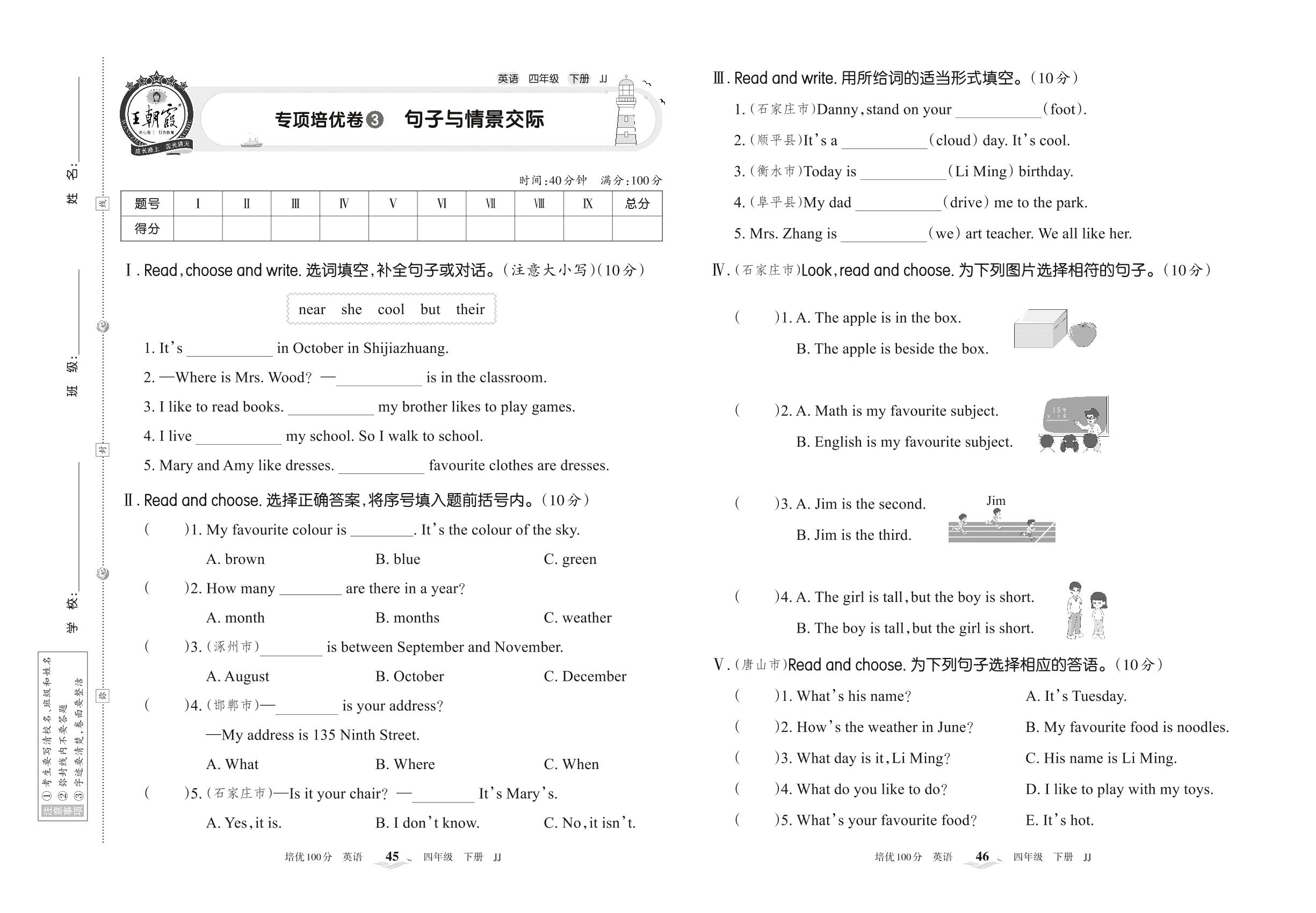 2022下册四年级英语冀教版 专项培优卷3 句子与情景交际
