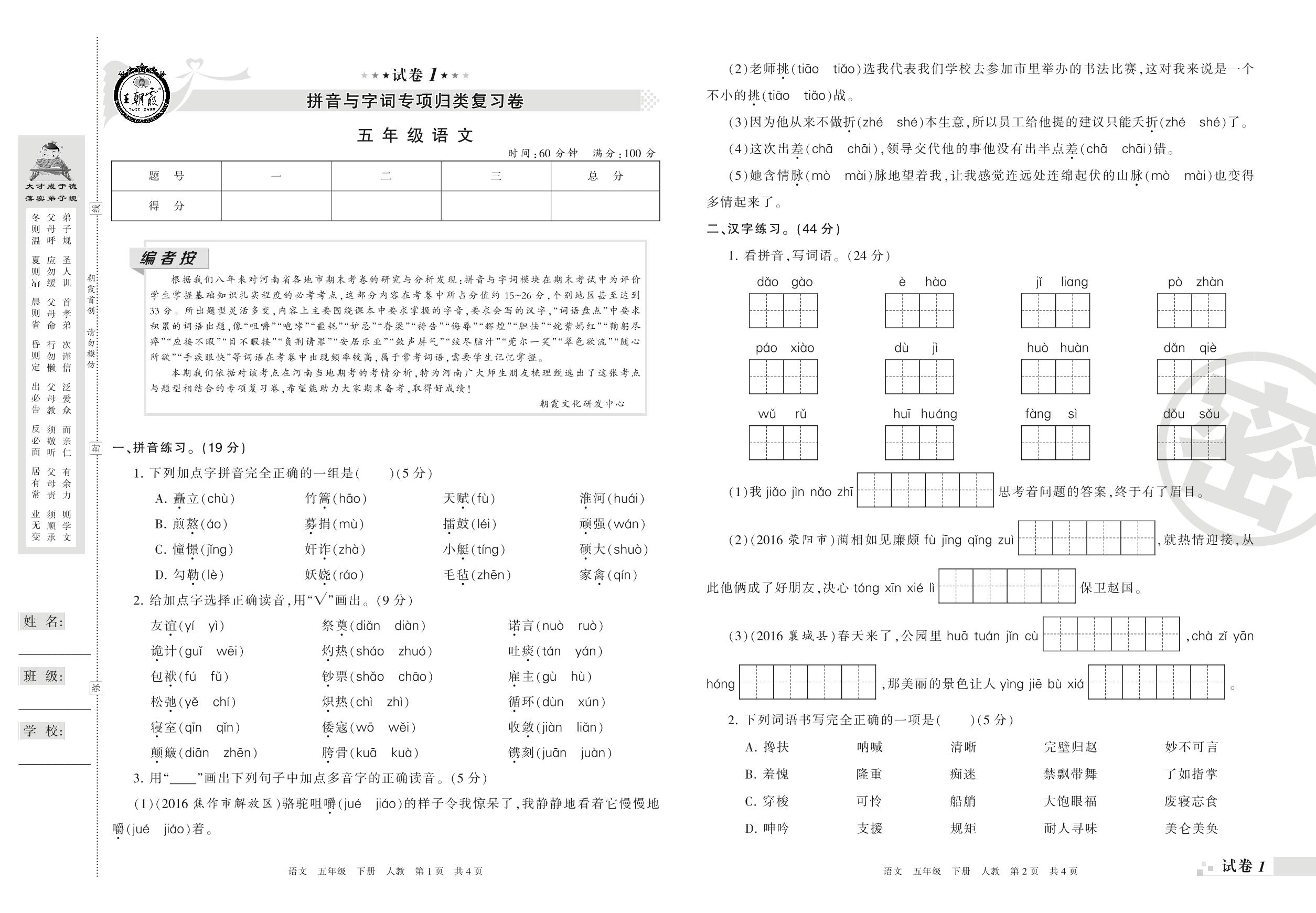 王朝霞期末专项卷——拼音与字词专项归类复习卷五年级下册语文(人教版)_R210801225804【1】