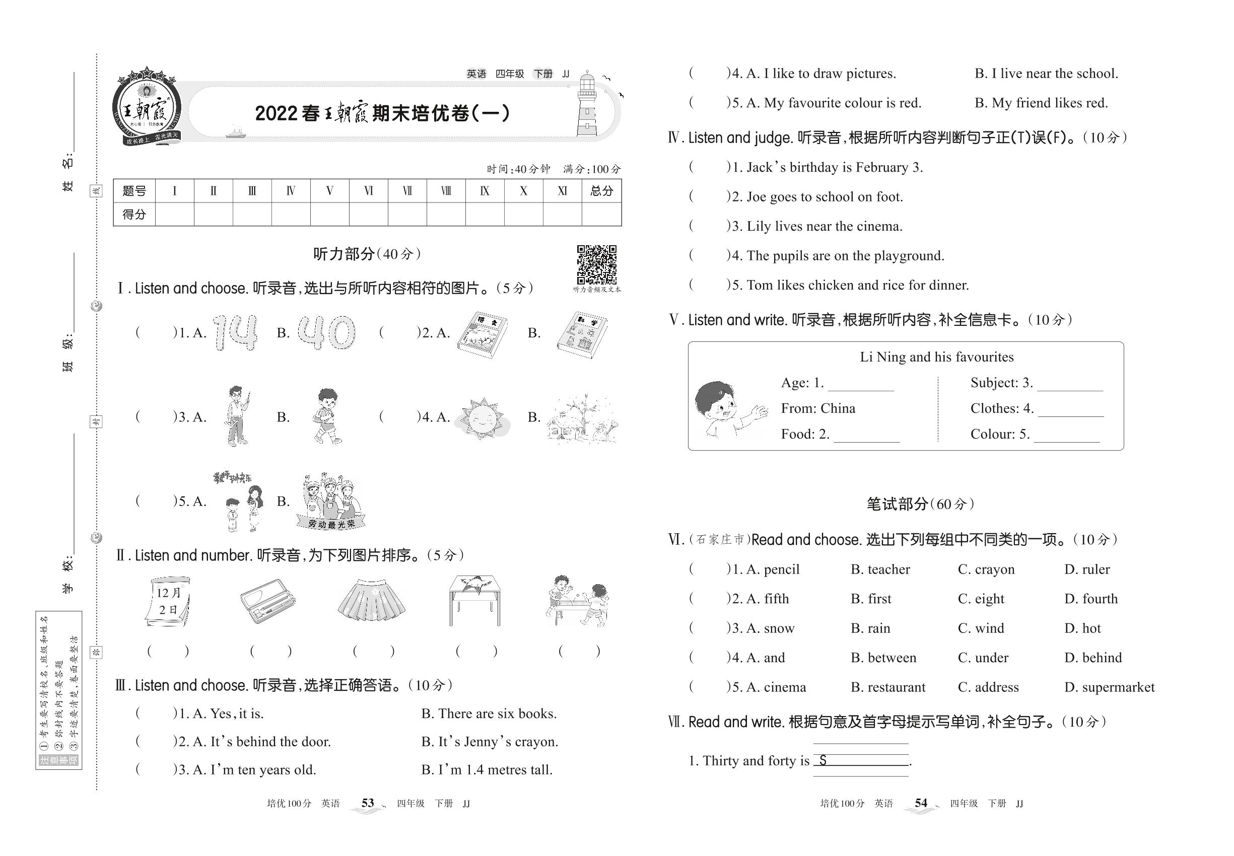 2022下册四年级英语冀教版 王朝霞期末培优卷(一)