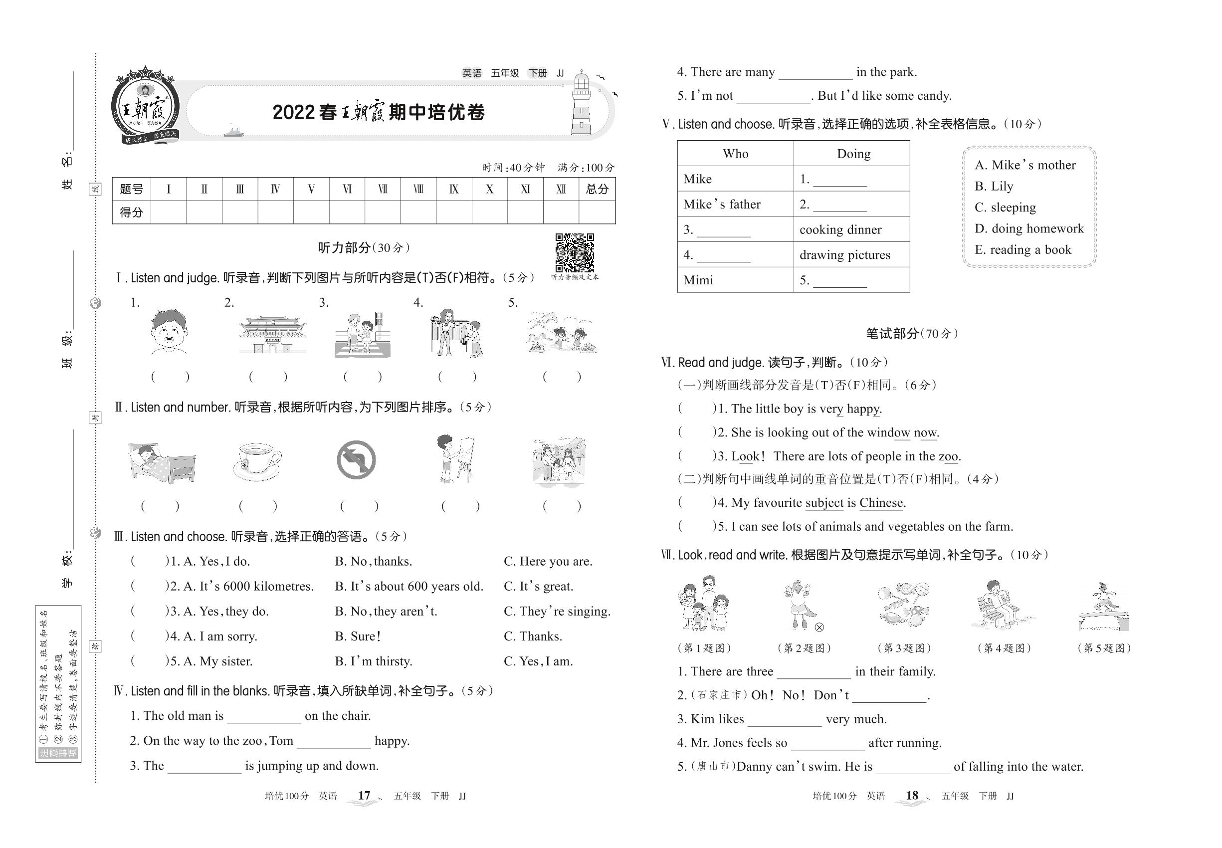 2022下册五年级英语冀教版 王朝霞期中培优卷