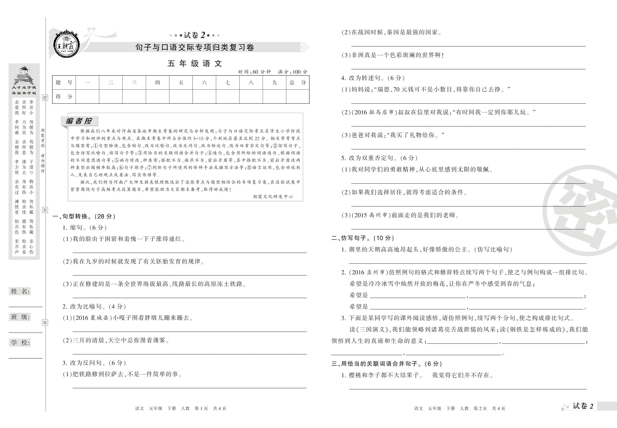 王朝霞期末专项卷——句子与口语交际专项归类复习卷五年级下册语文(人教版)_R210801225810【2】