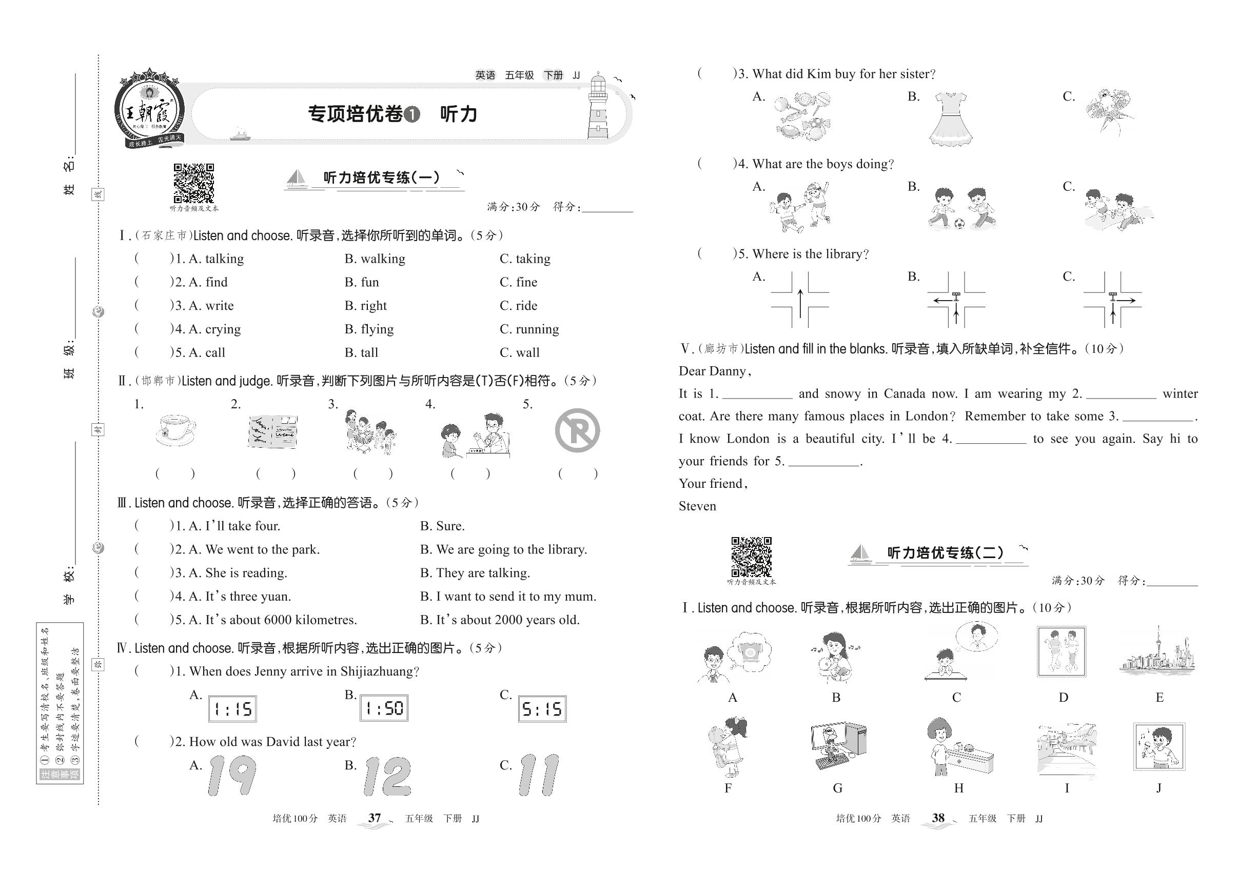 2022下册五年级英语冀教版 专项培优卷1 听力