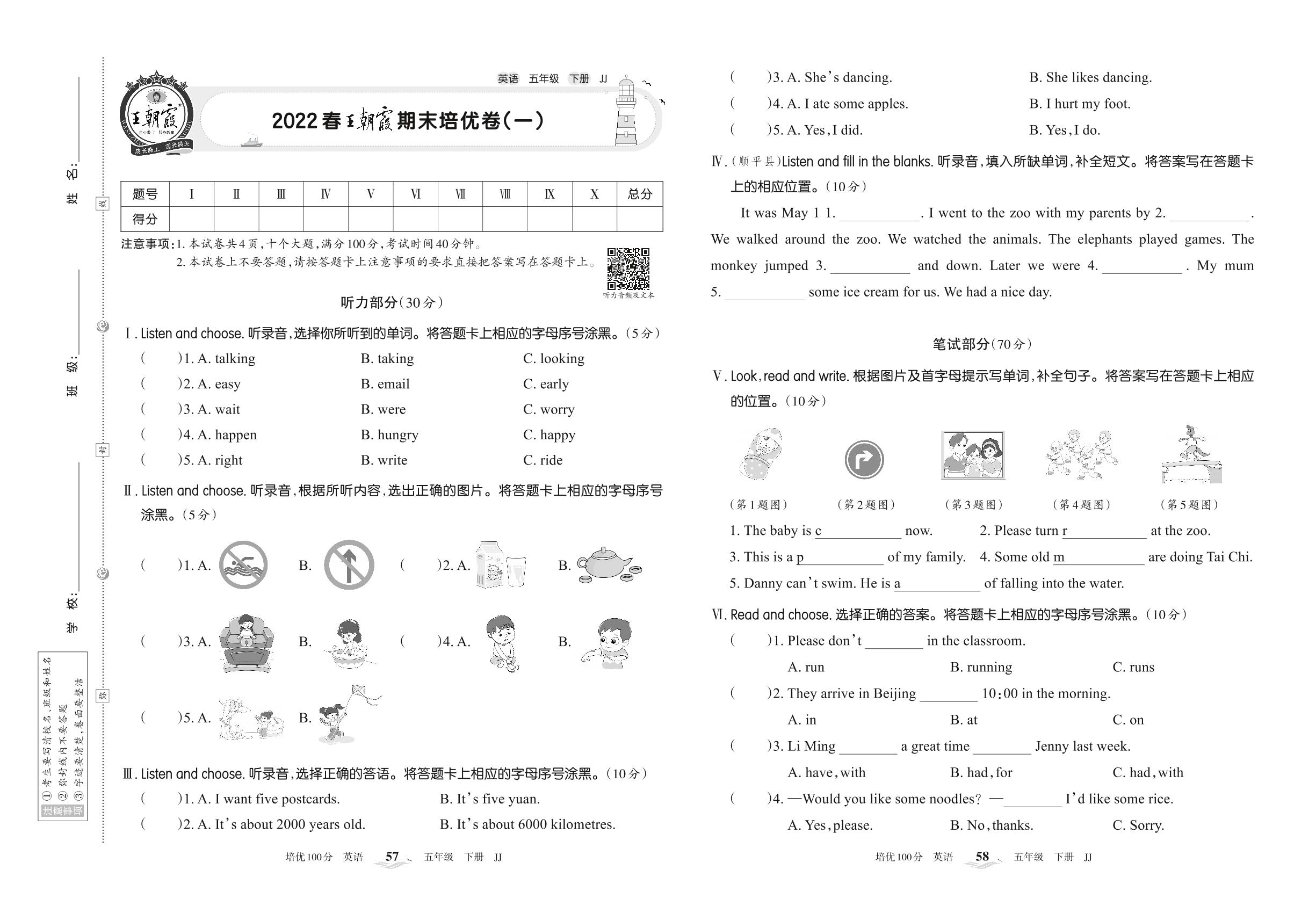 2022下册五年级英语冀教版 王朝霞期末培优卷(一)