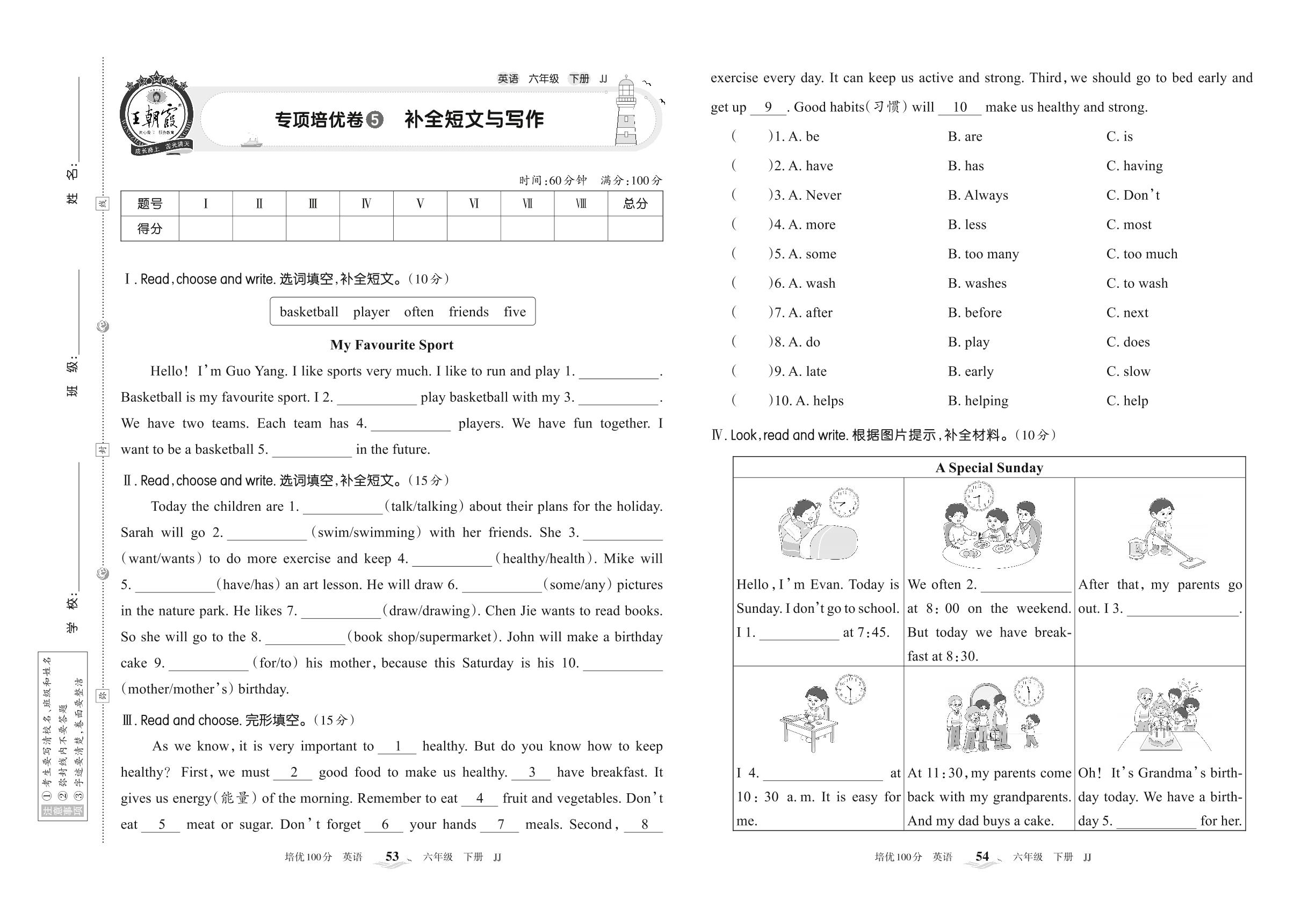 2022下册六年级英语冀教版 专项培优卷5 补全短文与写作