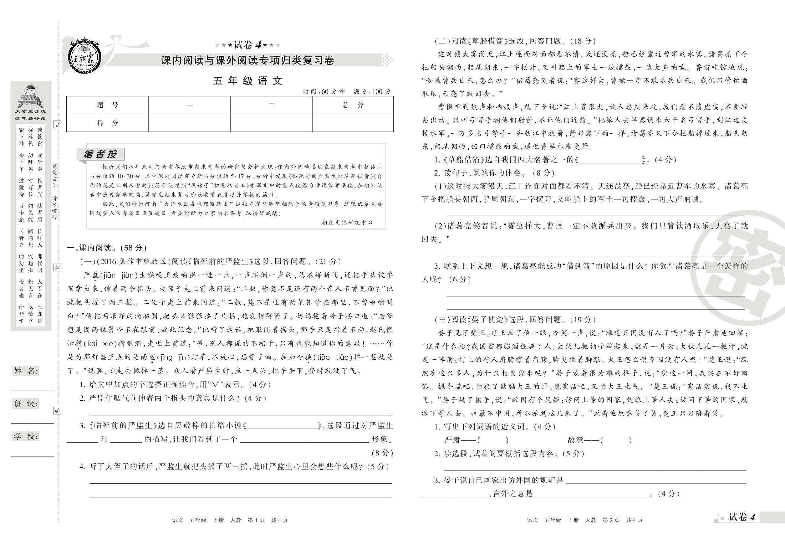王朝霞期末专项卷——课内阅读与课外阅读专项归类复习卷五年级下册语文(人教版)_R210801225824【4】