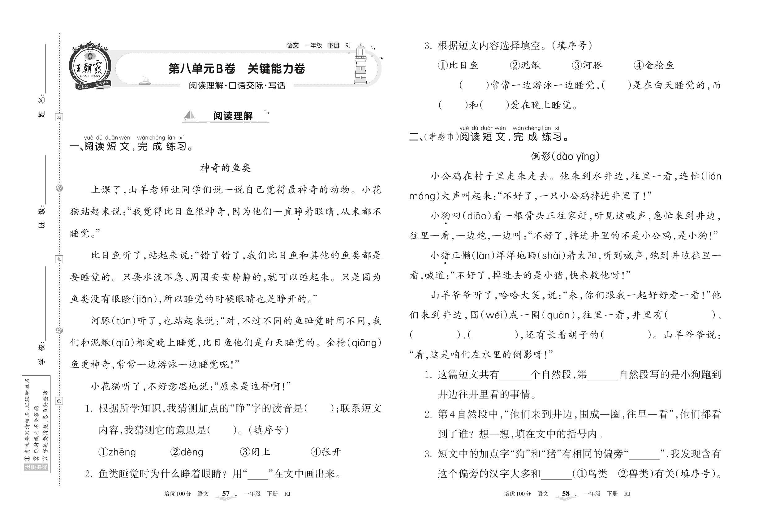 2022下册一年级语文人教版 第八单元B卷 关键能力卷