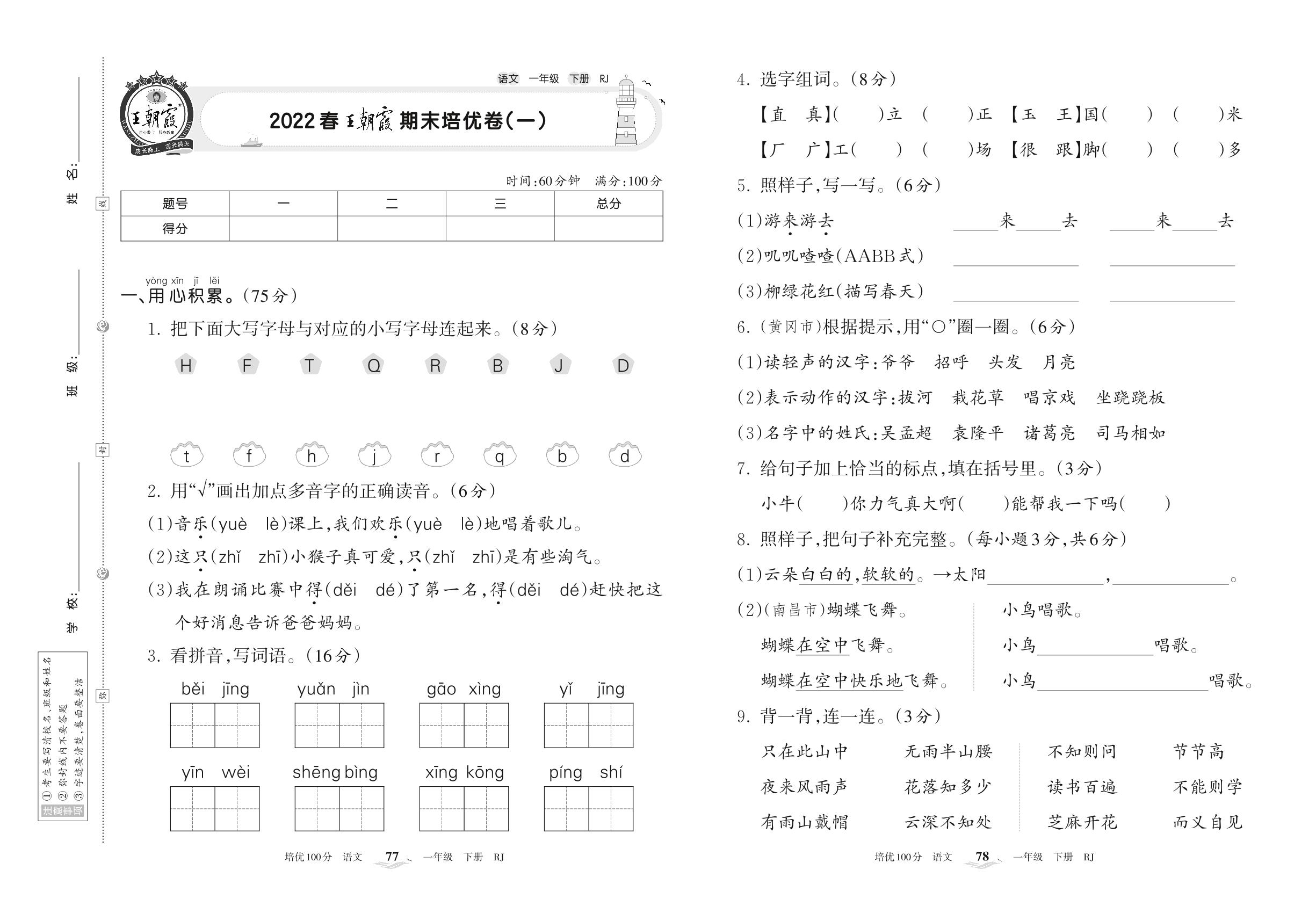 2022下册一年级语文人教版 王朝霞期末培优卷(一)