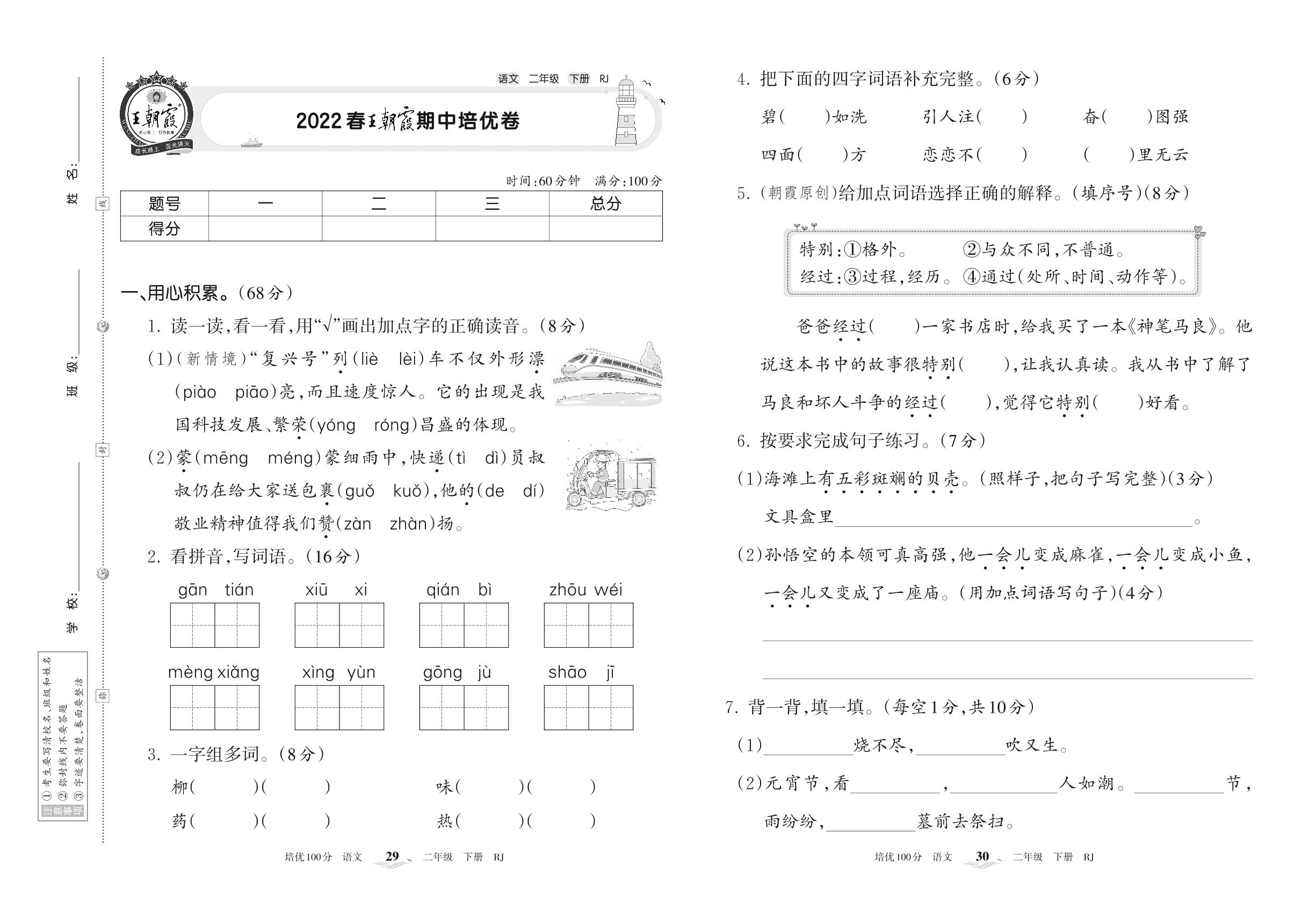 2022下册二年级语文人教版 王朝霞期中培优卷