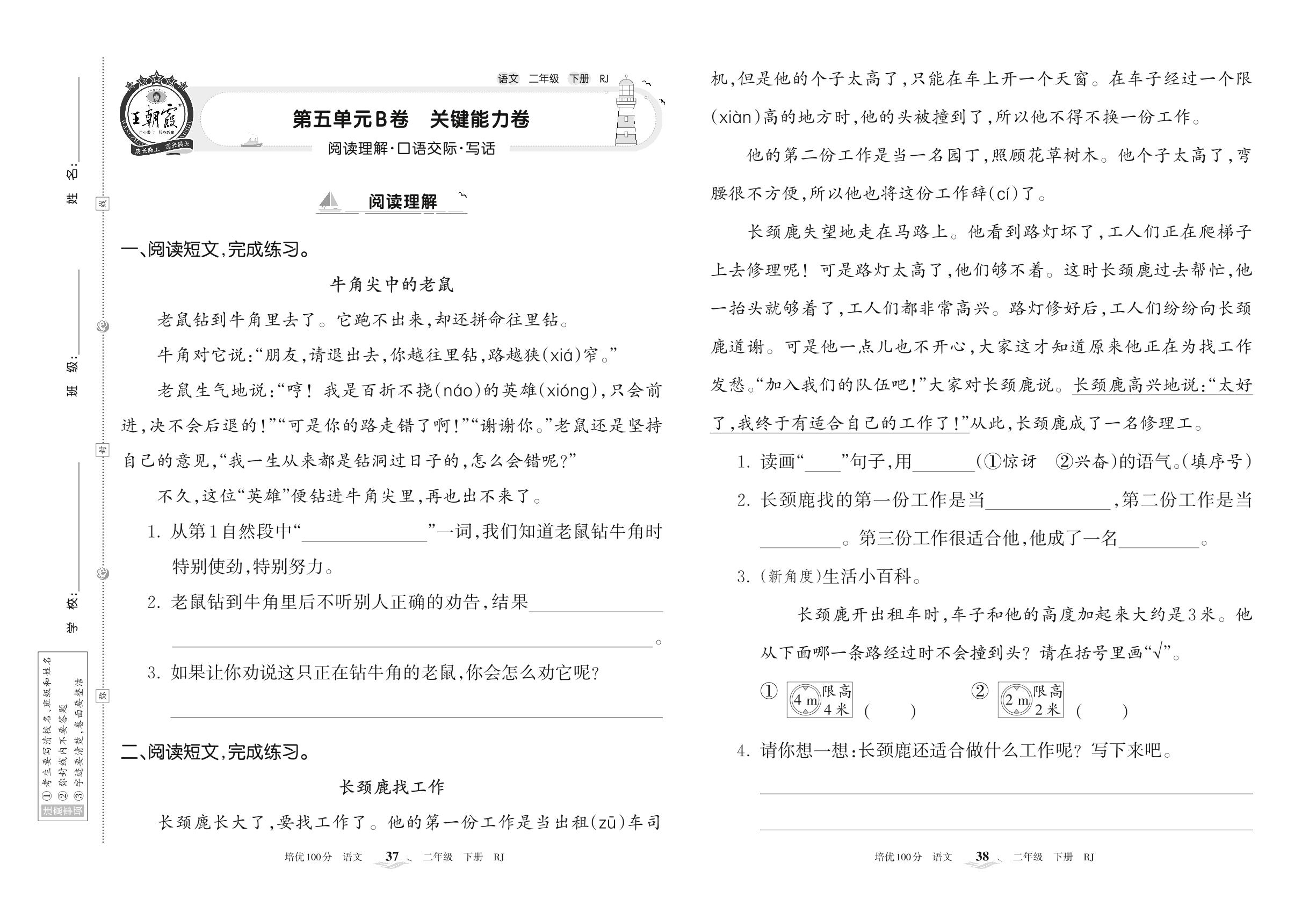 2022下册二年级语文人教版 第五单元B卷 关键能力卷