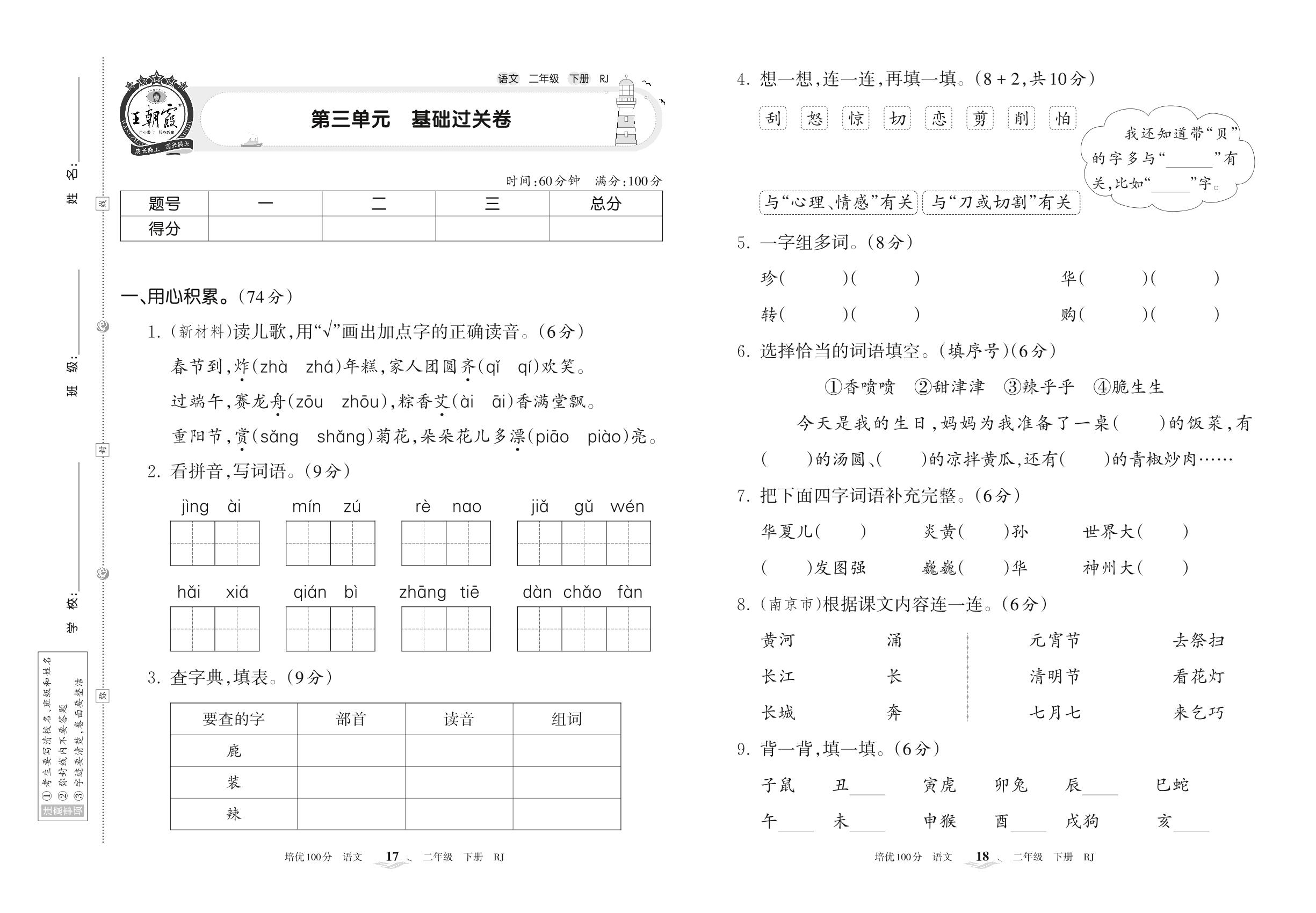 2022下册二年级语文人教版 第三单元 基础过关卷