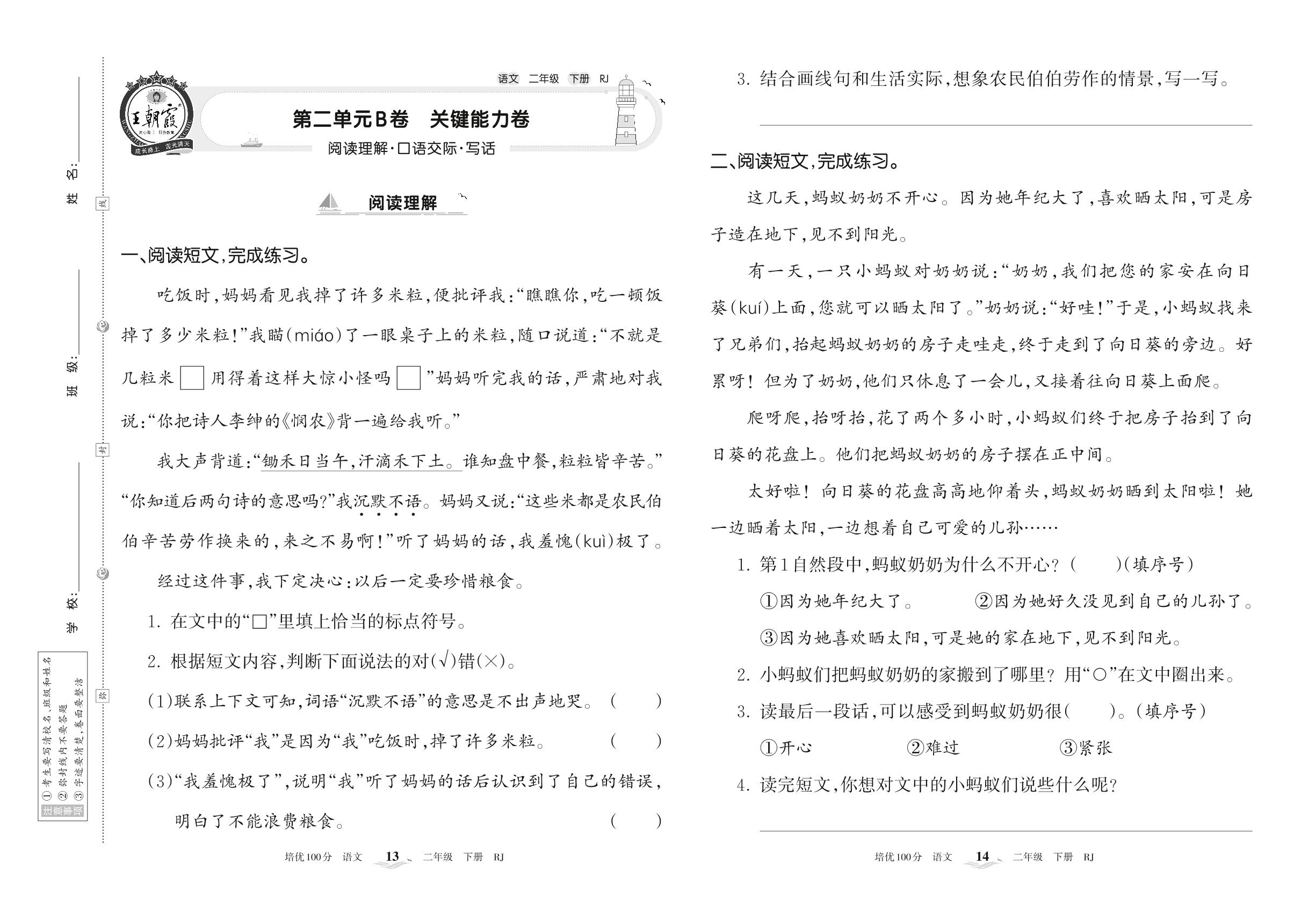 2022下册二年级语文人教版 第二单元B卷 关键能力卷