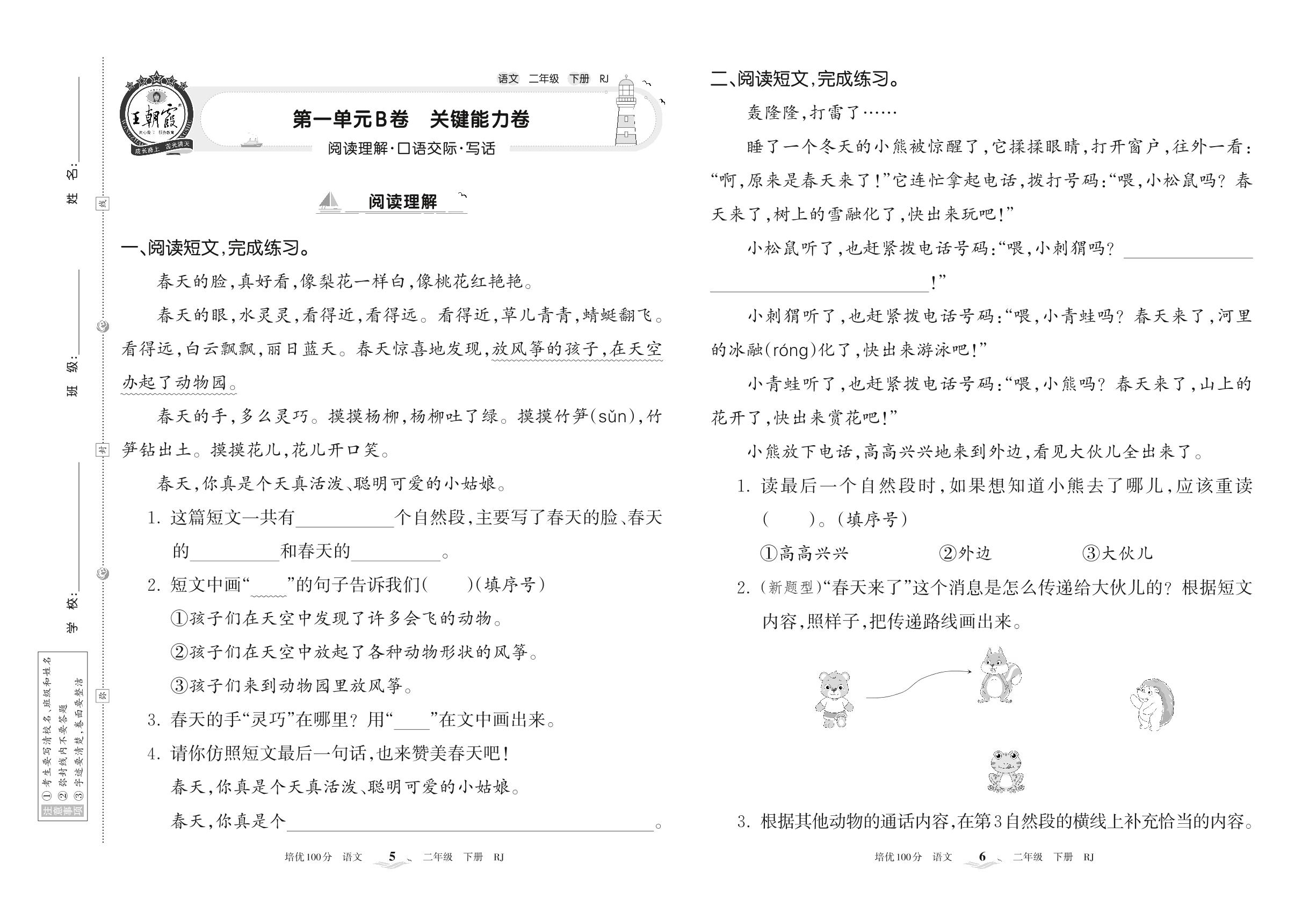 2022下册二年级语文人教版 第一单元B卷 关键能力卷