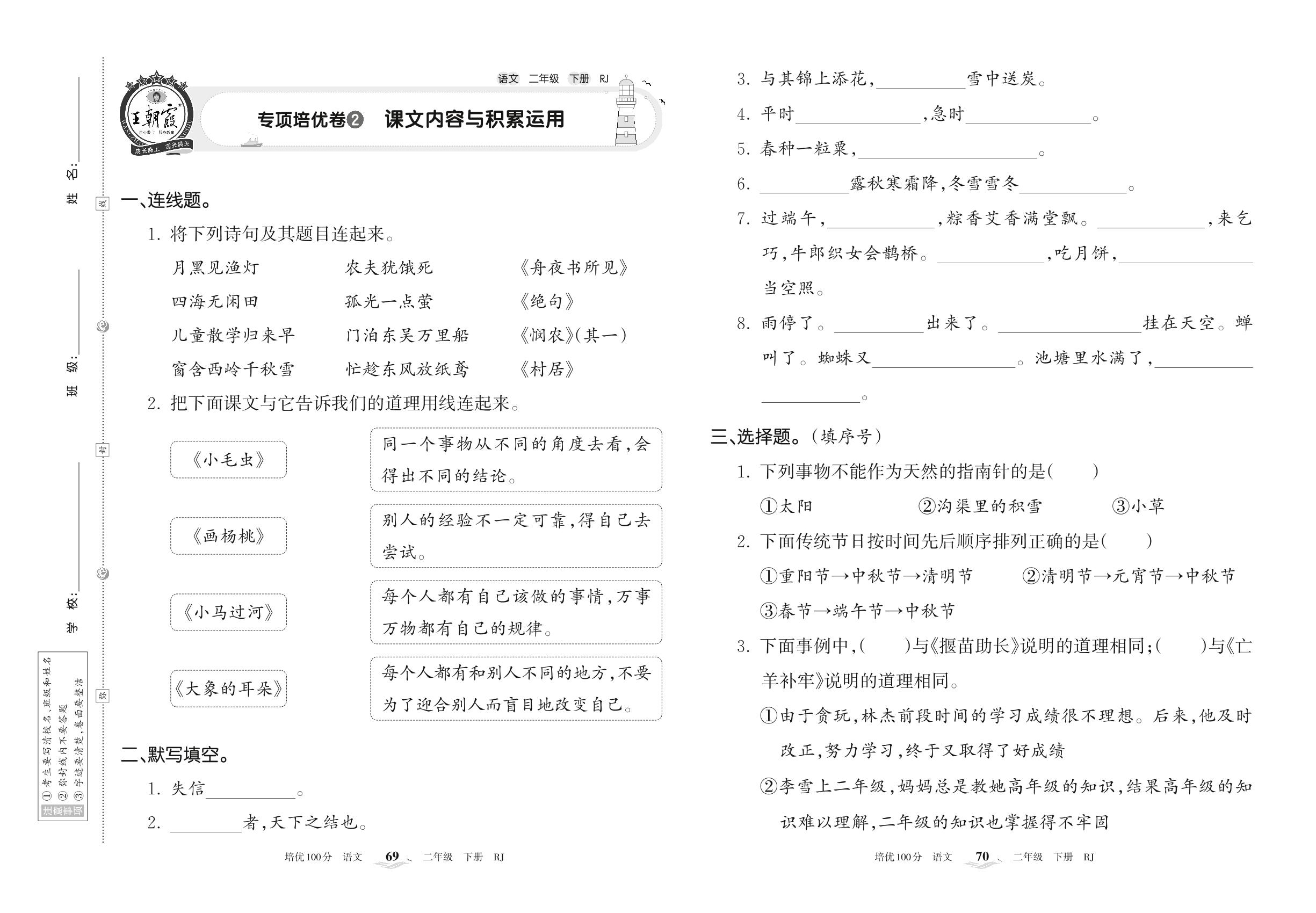 2022下册二年级语文人教版 专项培优卷2 课文内容与积累运用