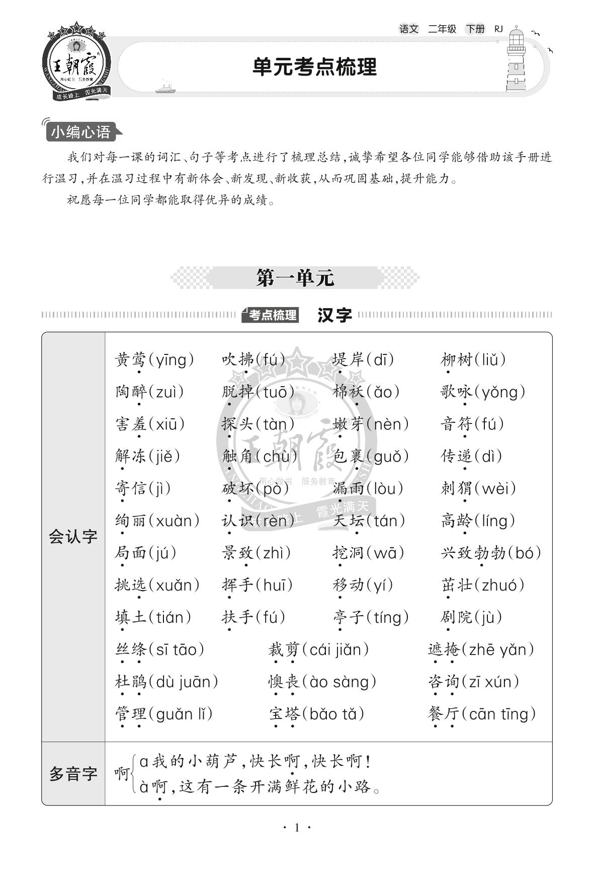 2022下册二年级语文人教版 单元考点梳理——第一单元